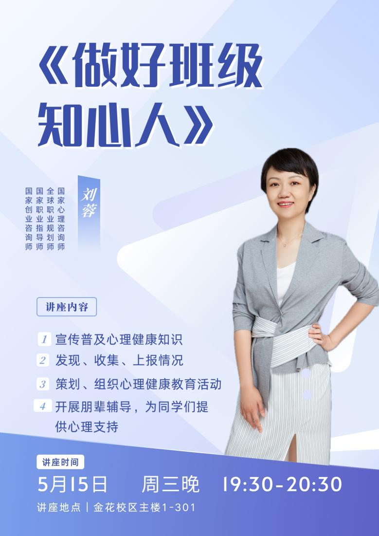 于5月15日晚19:30,在金花校区主楼1-301教室,邀请大学生心理健康教育中心刘蓉老师为心理委员及宿舍长开展题为《做好班级知心人》的培训讲座,此次培训由学院心理辅导员王丽丽主持,2023级金花校区全体心理委员、宿舍长及其他年级心理委员代表参加了本次培训。
