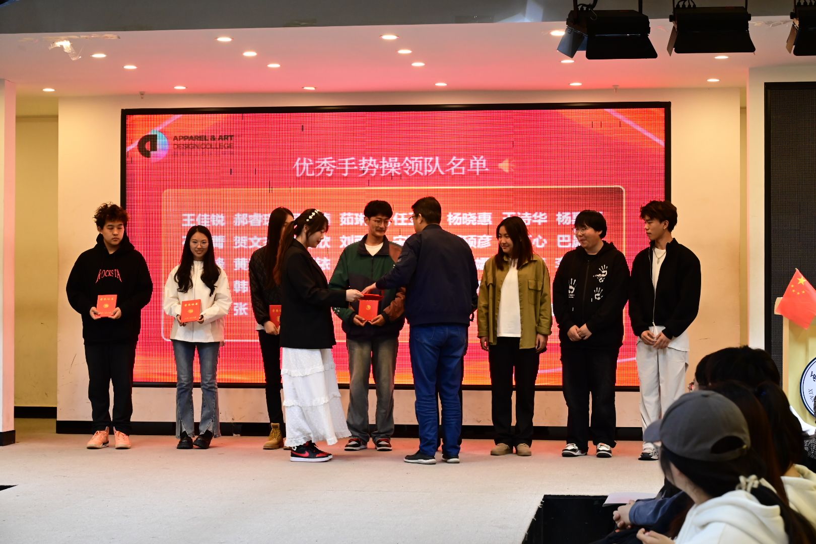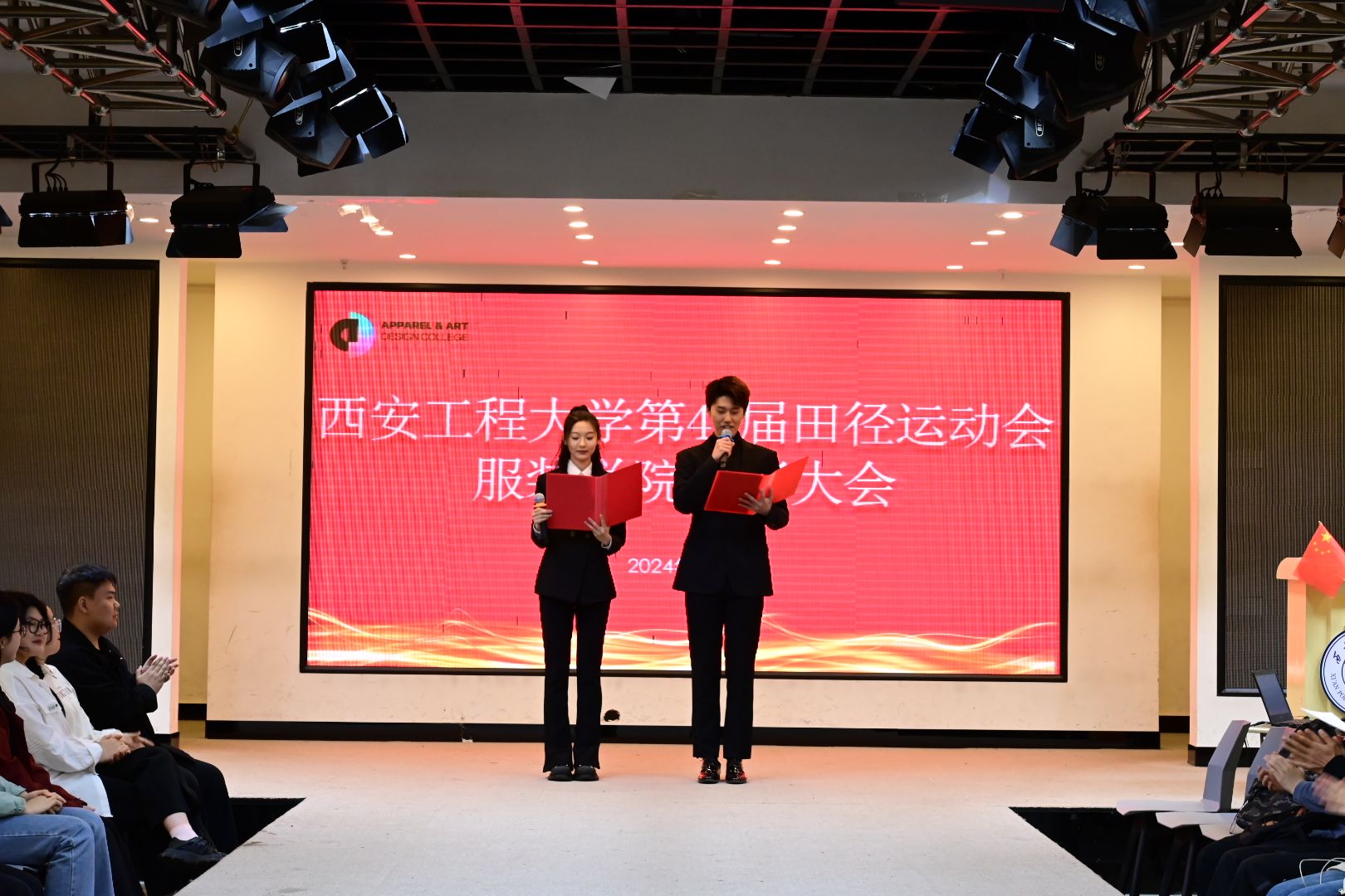 第42届田径运动会上,服装学院师生团结一心、奋勇拼搏,学生团体总分第一的好成绩再次成功卫冕,并荣获精神文明代表队荣誉称号,教职工代表队荣获全校第四名的成绩,再次实现了比赛成绩和精神文明双丰收。为了表彰运动员、精神文明班集体、优秀手势操领队、创意之星和开幕式演职人员们在本届运动会中的突出表现,鼓励他们再接再厉,4月29日晚,学院于金花校区服装楼表演厅召开本届田径运动会表彰大会,服装学院党委书记苏博、院长吕钊、副书记马磊、学生工作办公室主任蔡洋出席大会,部分专业课教师、各年级辅导员老师、全体运动员和工作人员参加此次大会。