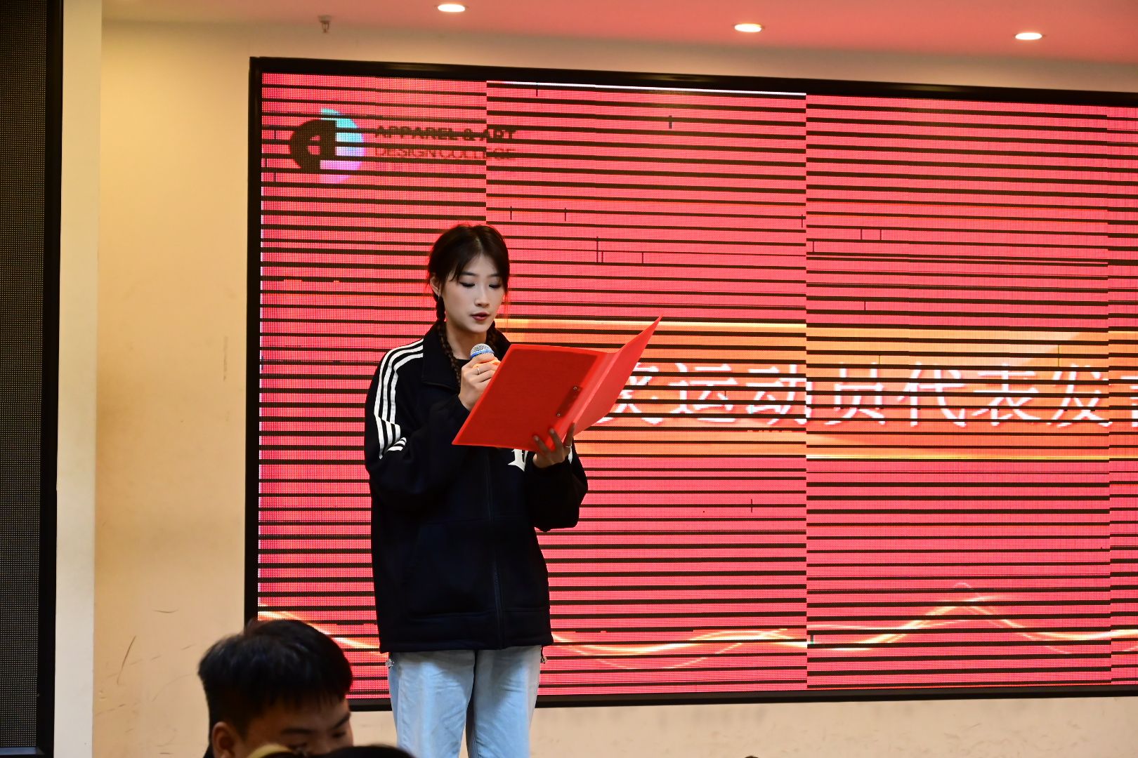 随着一段服院师生参加历届运动会的精彩视频回顾,表彰大会正式开始。大会首先对教职工代表队在本届运动会上的精彩表现和成绩进行回顾和宣读,紧接着宣读了对精神文明班集体、优秀手势操领队、创意之星、开幕式演职人员和运动员的表彰决定,并通过三段视频将同学们的思绪再次拉回到本届运动会上。随后,与会领导为获奖个人、集体颁奖。2022级产品3班胡佳玮、2022级美术学3班徐一天和2022级表演一班汤三洋子分别作为手势操领队代表、开幕式演职人员代表和运动员代表进行了发言。