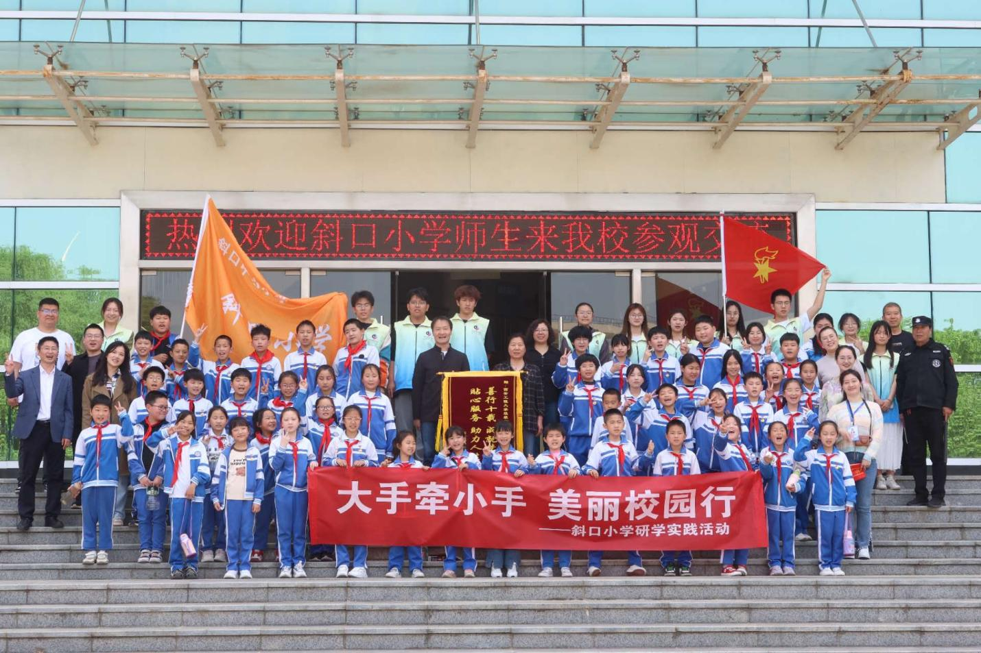 参观结束后,两校举行了授旗仪式。斜口小学校长邓瑞娟、副校长赵丽萍、总务主任薛小龙、大队辅导员杜康,红桃视频