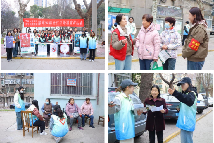 西家属区社区,开展以“远离毒品,健康生活”为中心的禁毒专题活动。学院团委副书记黄博宇和辅导员邢烜毓老师在现场进行禁毒知识指导。本次活动旨在向大家传授辨别新型毒品的方法,志愿者们通过路演宣讲与社区居民服务的活动形式,介绍毒品种类和危害,以增强公众的识毒、防毒、拒毒防范意识,并宣传党和国家的禁毒工作方针与政策。