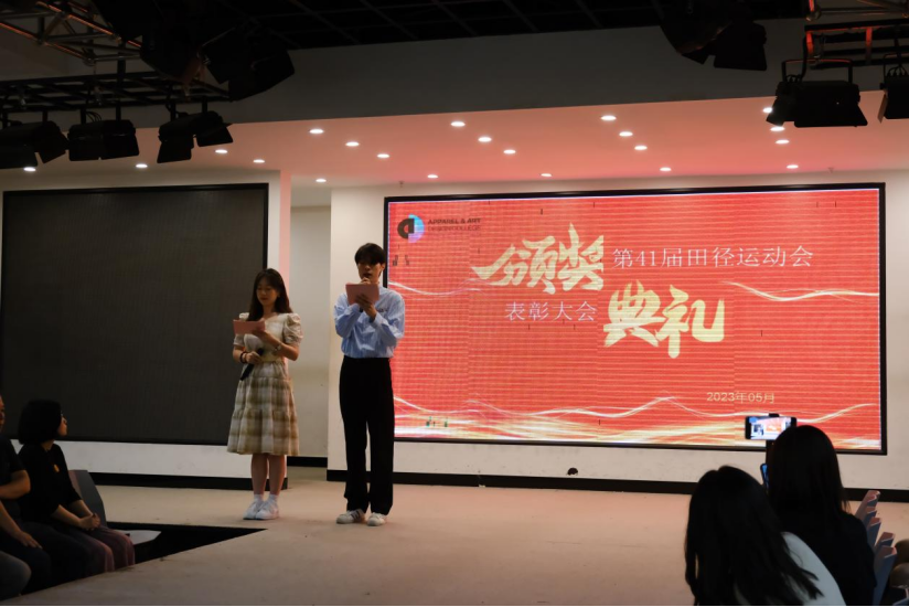 第四十一届田径运动会上,服装学院师生不畏困难、团结一心、奋勇拼搏,以356.5的团体总分成功卫冕,并荣获精神文明代表队荣誉称号,实现比赛成绩和精神文明双丰收。为了表彰运动员、领队、开幕式演职人员和看台方阵同学们在本届运动会中的突出表现,鼓励他们再接再厉,5月18日中午,学院于金花校区服装楼表演厅召开本届田径运动会表彰大会,并于临潼校区A栋304教室设置分会场。服装学院党委副书记郭欣欣、学生工作办公室主任蔡洋出席会议,各年级辅导员老师,全体运动员、领队、开幕式演职人员和运动会其他工作人员参与此次会议。