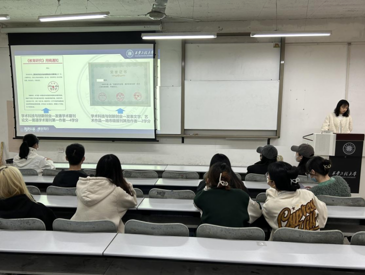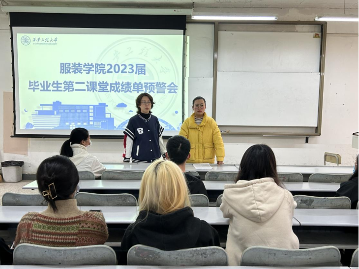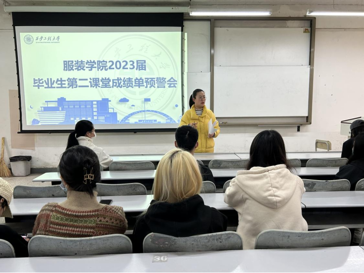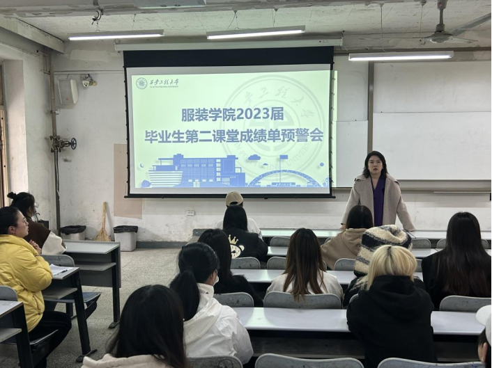 为加强应届毕业生对第二课堂成绩的重视,在前期持续督促毕业生积极参与第二课堂活动的基础上,2023年3月29日下午,服装学院在金花校区主楼128教室召开2023届毕业生第二课堂成绩单预警会,服装学院团总支书记马薏雯、副书记孙晨倩、2019级辅导员李涵博以及学生干部和部分2023届毕业生参加会议。