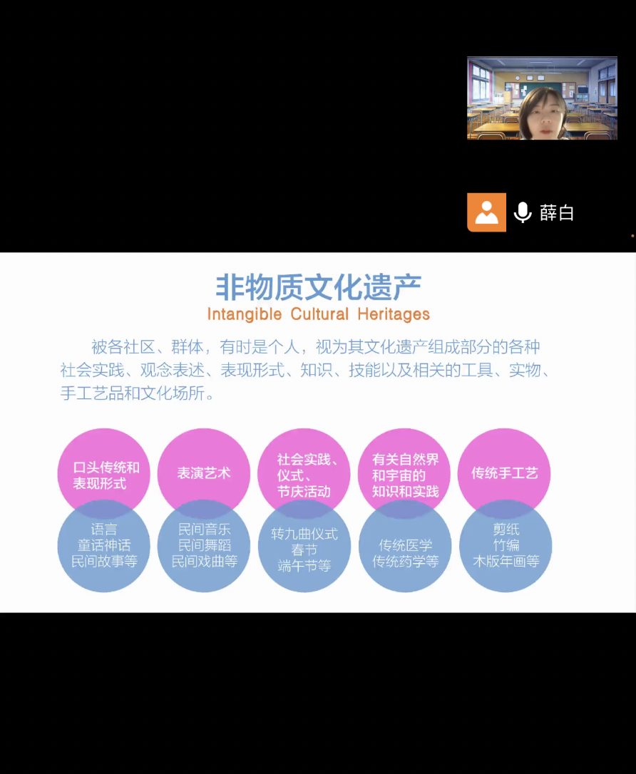 薛白老师从介绍我国非遗的现状及保护措施出发,分享了她多年从事相关研究和教学实践的成果。她以图文并茂的形式对非遗保护中静态和动态两大形式进行解析,通过对多个优秀案例的非遗文化背景和内涵的介绍来分析视觉表现的可能性。薛白老师在分享中强调了从事非遗文化的视觉表现工作一定要进行田野调查,了解非遗创作群体、制作工艺、文化内涵,感受当地文化,在视觉创作中需充分了解元素的含义和搭配规律。最后薛白老师还讲解了在进行非遗的文创设计中必须充分考虑作品的目标受众和传播意义,使同学们进一步认识到优秀的非遗文创设计所具有的特性。