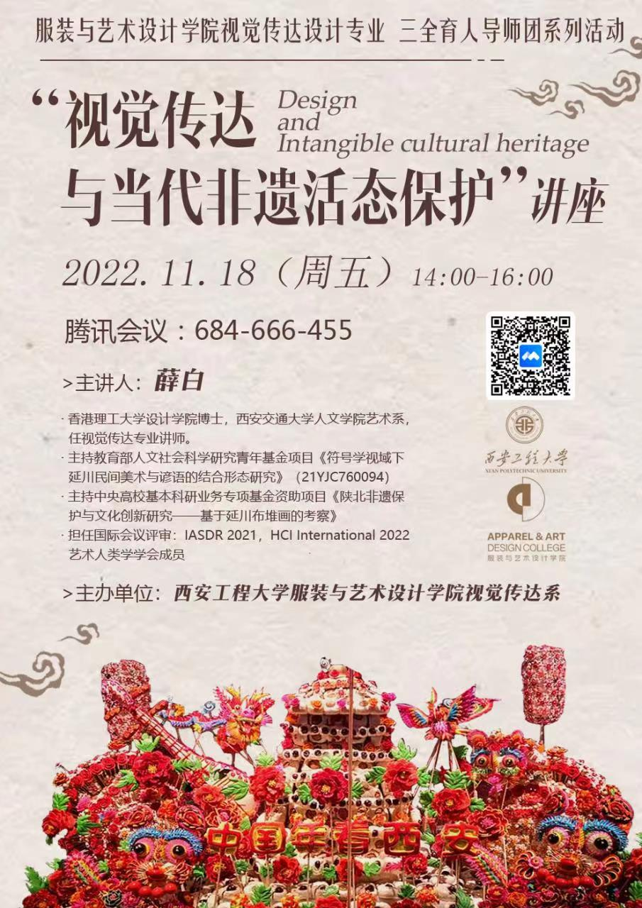 为树立文化自信,推广优秀传统设计艺术文化,帮助学生了解我国非遗现状及保护措施,探索民间美术类非遗与视觉设计的结合与应用。2022年11月18日下午,服装学院视觉传达系邀请西安交通大学教师薛白为全系师生进行《视觉传达与当代非遗活态保护》线上讲座。本次讲座由服装学院视觉传达系陈熊俊老师主持,视觉传达系全体师生参加讲座。