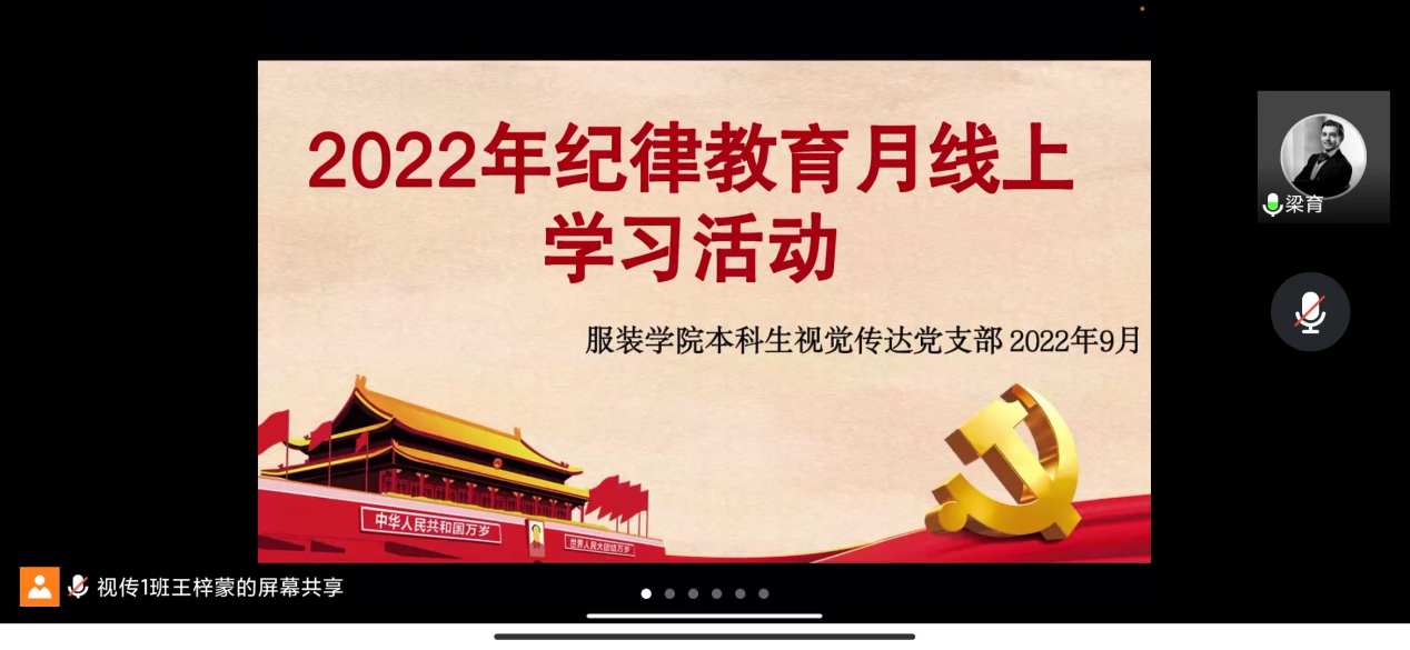 按照学校《关于在全校开展纪律教育学习宣传月活动的通知》以及开展党史学习教育理论学习等方面通知要求,2022年9月13日晚,服装学院本科生视传党支部组织开展线上理论学习活动,由支部书记梁育老师主讲纪律教育、党史学习教育主题党课,支部全体党员参加学习。