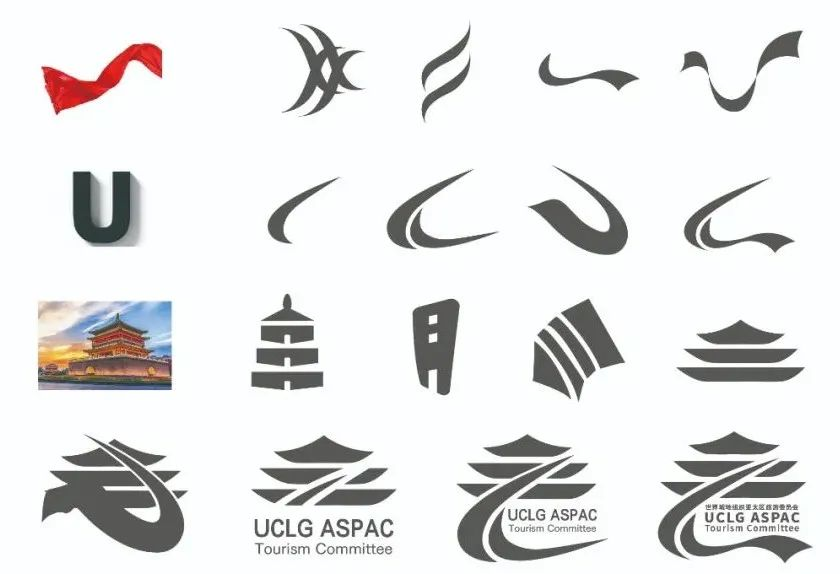 丝绸是纽带,将城市和地区紧紧相连,同时也体现出了“一带一路”倡议。而委员会首字母U字符本身也有着积极向上、创新发展的含义。把二者变形结合,它便是象征包容一切、开拓前进、团结一致、和谐发展、连接不同城市与地区的一条纽带。由于发起城市西安,建都历史悠久,文化产业发达,旅游资源丰富,因此也选择了钟楼的简化形象作为设计的上半部分,既是委员会发起城市西安的地标性建筑,代表西安,又可以看作是整个传统文化的缩影。在突出西安历史悠久、文化底蕴深厚的形象同时,也不显突兀和刻意。两部分穿插结合,给予图形动势,其意在反映出文化旅游以及对城市发展的贡献,同时又面向世界,把多彩的文化、真诚的友谊、创新的精神和自由的态度带给每一座城市,带向每一个人。