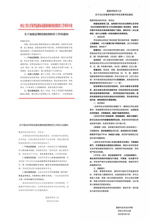 服装学院高度重视、认真落实我校关于2022年春季开学相关要求,结合学院返校人数多、分布地域广、校区返校时间不同等特点,制定计划、精心谋划,措施具体、责任到人,确保全院4000余名学生分批、安全、有序返回学校,确保2022年新学期顺利开局。
