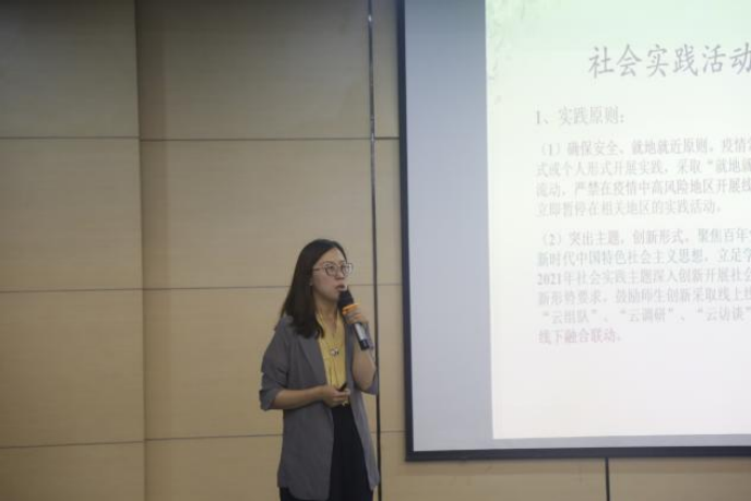 会议伊始,团总支书记马薏雯首先介绍了此次暑期社会实践活动的背景意义,随后马老师从实践主题、参加对象、实践原则、实践形式、实践内容、时间安排以及工作要求七个方面对2021年暑期社会实践活动进行了深度讲解。她还强调;“暑期社会实践活动是一门重要的功课,参与暑期社会实践有助于同学们认识社会,在实践中把握自己。大学生应积极参与,从实践中增强社会责任感,从实践中学真知。”