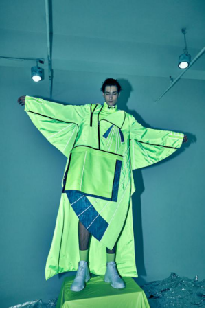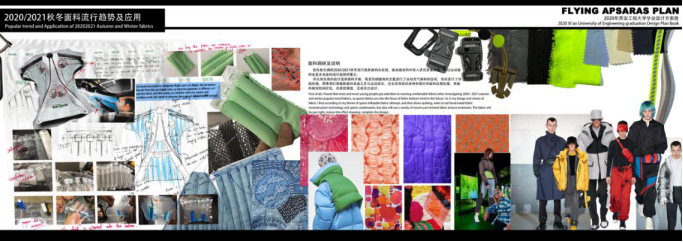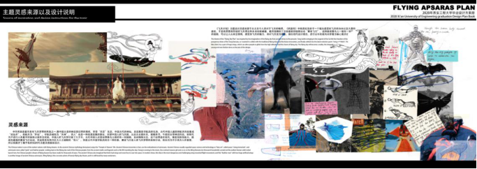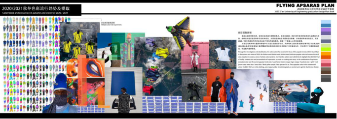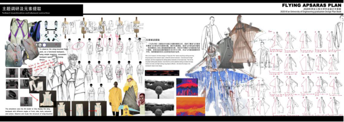 《飞天计划》主题设计灵感来源于从古至今人类对于飞天的畅想,《妖猫传》中杨贵妃荡秋千一个镜头感受到飞天的自由以及大唐的盛世,于是我想要将传统的飞天想法和未来创新碰撞,最终落脚到了目前最新的极限运动“翼装飞行”,这种服装像鸟儿一般有一双巨大的翅膀,可以让人从高空滑翔,感受到飞天的魅力。将对飞天变为现实,融合现代设计理念,将设计与市场结合,进行以年轻新风尚穿着为轴心展开设计。