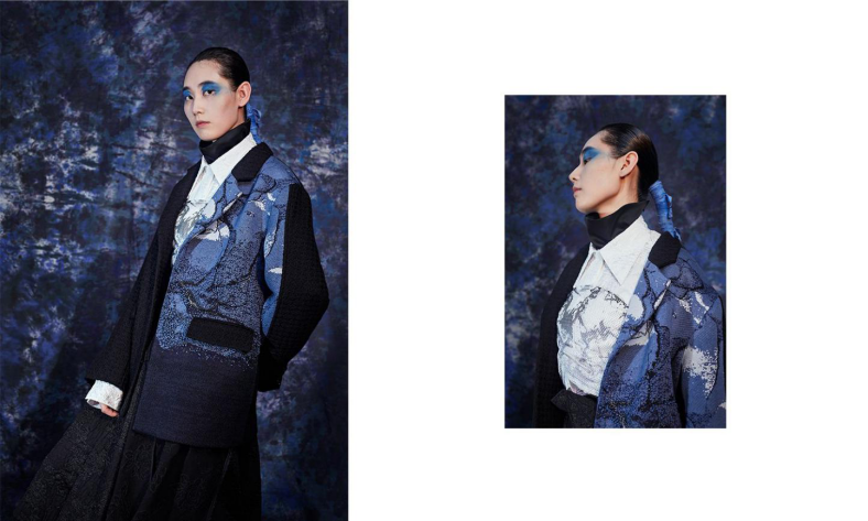 如果时间倒序,妈妈也曾是个少女,她们也曾留起长长的秀发,如今她们是拼杀在职场和生活之间的勇士,应该有一份属于妈妈的献礼。结合职场女性干练优雅和少女服饰轻快浪漫的装饰特点,让人们记起那个平淡又热情,自由又浪漫年代下自己的妈妈。《性感的血是蓝色的》整个系列服装面料使用织锦提花和羊毛面料进行服装制作,使其呈现出丰富的层次,蓝蓝的色彩辉映其中,让人记起一个传说,蓝色是少女的颜色,粉红色才属于男孩子。