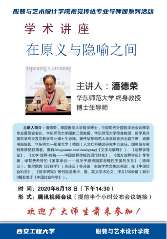 视觉传达专业学生的思想文化品味,提升该专业学生的内涵建设,服装学院视觉传达专业合力育人导师团积极组织本专业学生于6月18日14:30开展线上学习,聆听了华东师范大学终身教授、博士生导师潘德荣网络线上学术讲座《在原义与隐喻之间》,视觉传达专业约80余名同学观看了讲座直播。