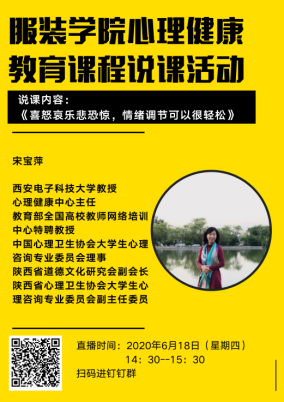 6月18日下午,服装学院2019级一年级导师一团组织学生在线观看了陕西高校心理健康教育讲座,本场心理健康教育说课由西安电子科技大学的宋宝萍老师主讲,主题是“喜怒哀乐悲恐惊,情绪调节可以很轻松”,通过观看讲座和会后讨论,同学们纷纷表示获益匪浅。