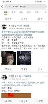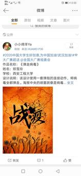 3月1日至10日,学院视觉传达、产品设计、广告学、工业设计等相关专业的学生在学院团总支的动员和专业教师的指导下,参加了由大赛组委会和中国网络视听节目服务协会发布的2020第十二届全国大学生广告艺术大赛公益命题《战“疫”》作品微博征集活动,既宣传了防控新型冠状病毒肺炎的知识,鼓舞了战疫士气,又训练了专业技能,丰富了居家学习生活。