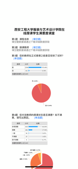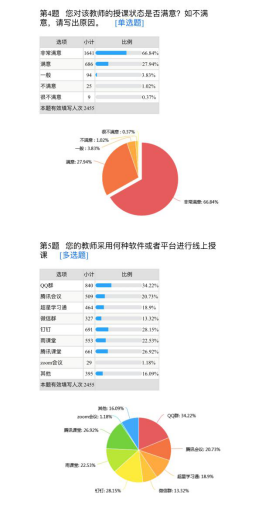 在线授课学生满意度调查问卷》,根据对2455位学生问卷的数据统计,对教师授课状态满意度达94.78% ,对线上教学效果的满意度达89.2%,对课程的线上授课整体情况满意度为91.16%。总体效果良好,但也反映出一些问题,有待在接下来的授课与工作中积极解决,使线上授课的效果达到更加满意的结果。