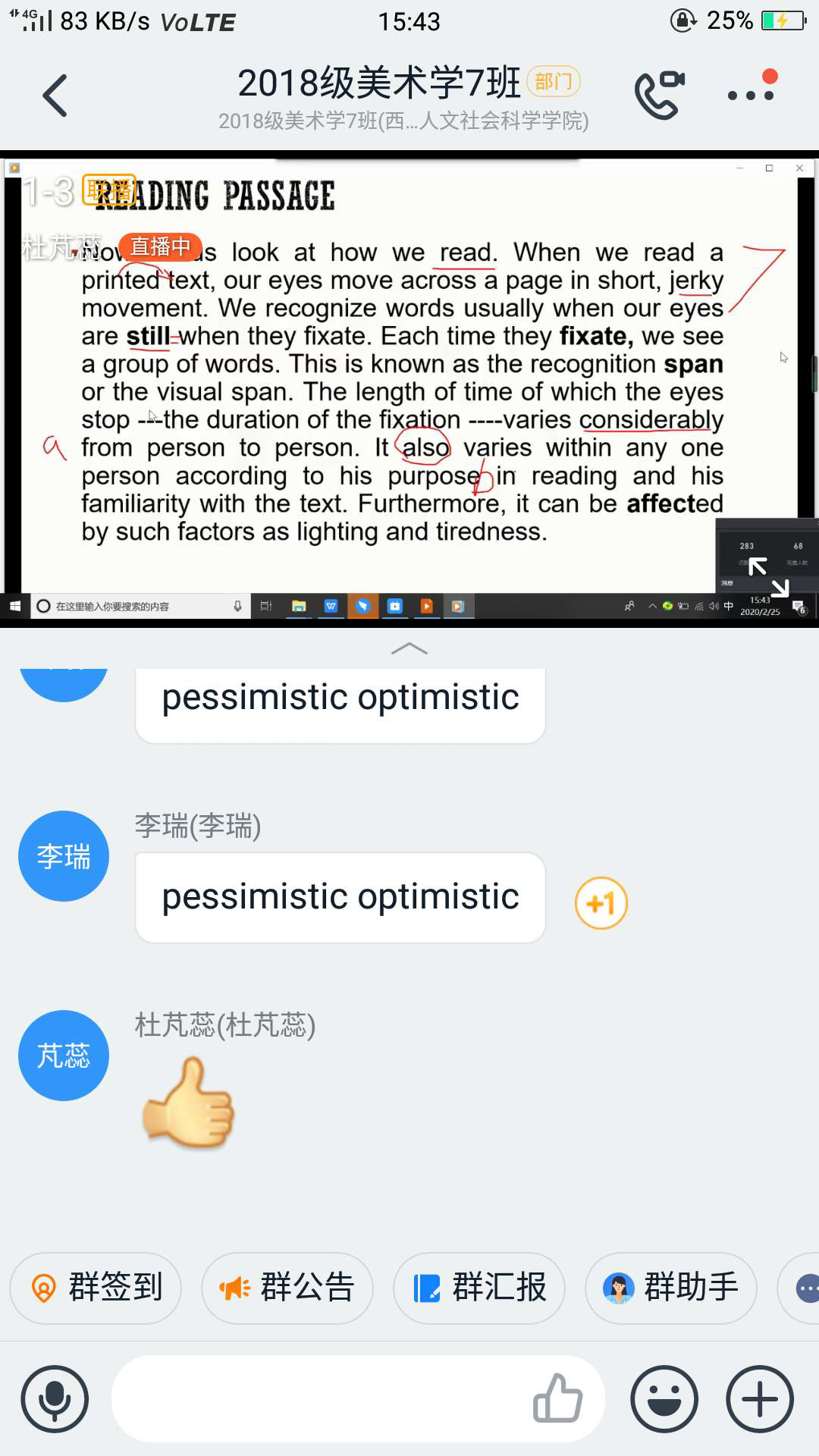全体师生精神面貌积极向上,教学质量稳定。除刚开始有个别教学平台出现问题,相关教师均能及时启动预案,确保教学任务不受影响。目前绝大部分教师和学生都已经逐渐适应了线上的教学的新方式,能够充分利用网络信息化手段,线上教学秩序井然有序。