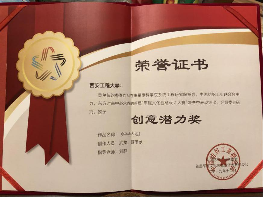 3、由刘静老师指导的2016级服装设计专业武龙、薛雨龙同学的作品《中华大地》在军旅时尚版块获得“创意潜力奖”;