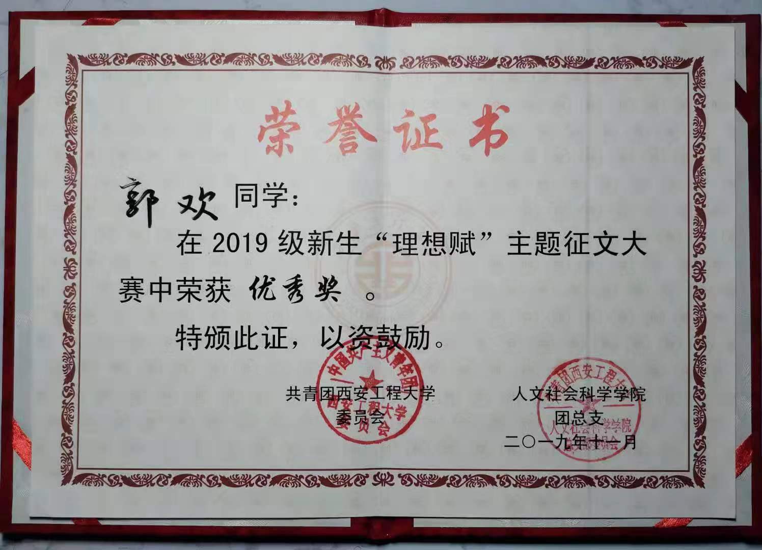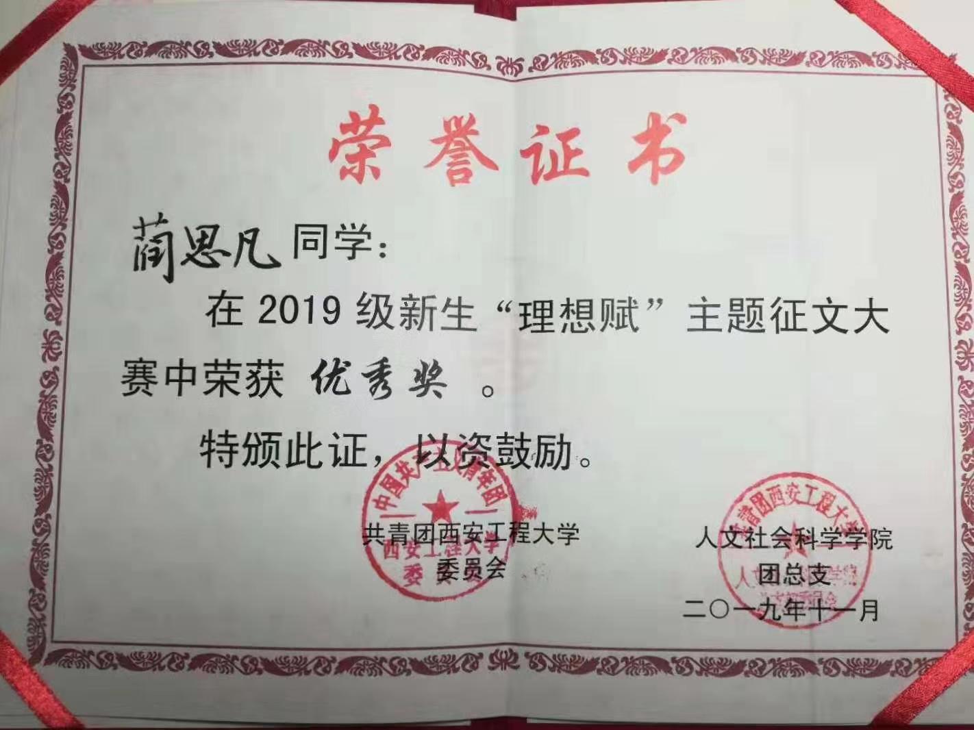2019级新生“理想赋”主题征文大赛,全年级共征集稿件95份,其中设计学类01班蔺思凡、07班郭欢荣获优秀奖。