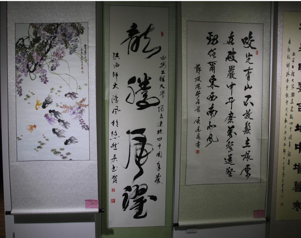 校党委副书记赵小峰、副校长李鹏飞,校党政办、离退办、国际交流合作处、宣传部、校医院等部门的领导及我校校友、部分离退教职工、学院师生共100余人参加了此次书画展的开幕式。本次师生书画作品展共展出作品96幅,其中包括书法作品57幅,绘画作品31幅,还有陕西省老教授协会、陕西师范大学赠送的8幅作品。这些作品在讴歌我国建设取得的辉煌成就,赞美我校发展取得的丰硕成绩的同时,也展示了我校育人的成果,记录了奋发进取的时代历程,抒发了我校师生对学校的浓厚情感。