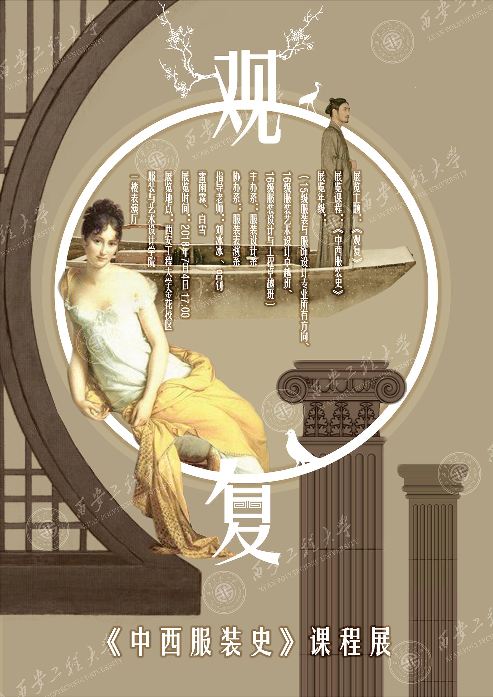 此次课程展主题为《观复》,复原接近于各个时期的服装面貌。优秀作品经历了两个学期的选拔,是从15级服装与服饰设计专业所有方向、16级服装艺术设计卓越班、16级服装设计与工程卓越班。近560件成衣作品中甄选出87件作品,作品从复原的角度向大家呈现了西洋服装从古代奴隶制社会时期一直到19世纪代表的服装样式;中国服装从先秦时期至清代代表的服装样式。