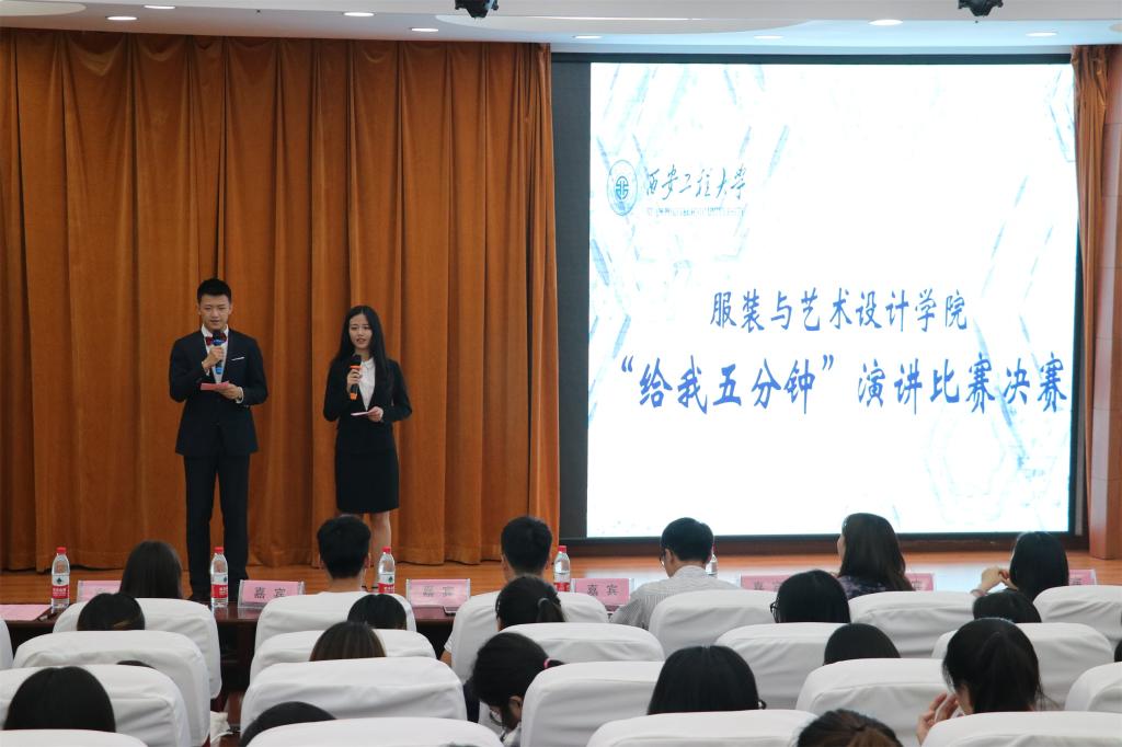 为活跃我校的文化氛围,增进同学之间的交流与了解,提高同学们的综合素质,进一步确定同学们的人生目标,正确的认识自我价值,由服装学院学生会承办的“给我五分钟”演讲比赛,于5月2日、23日和30日分别进行了初赛、复赛和决赛。服装学院全体同学参加了本次比赛,并筛选出12名选手参加30日的决赛,评出1名一等奖,1名二等奖,1名三等奖及9名优秀奖。服装学院院学生会主席和各兄弟学院主席及代表出席了本次活动并担任评委。