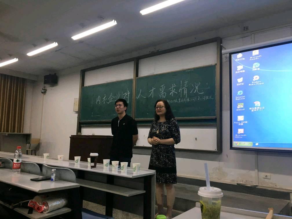 内衣系主任刘驰教授介绍了广东新怡内衣集团有限公司总裁何俊文先生,同学们表示热烈欢迎。