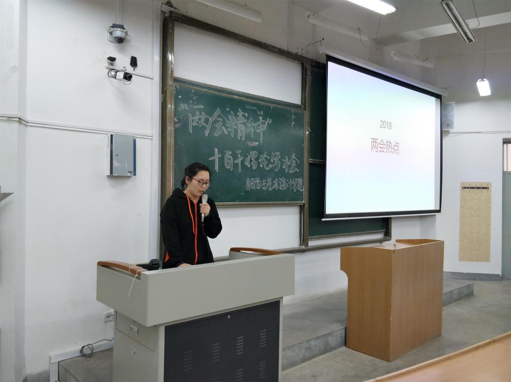 大会开始,团总支书记马薏雯阐述了大学生学习贯彻两会精神的意义。全国两会的主题就是关于我国的发展,就是实现我们自己的“中国梦”。作为大学生要以身作则,立足于学业,把学习两会精神的成效转化为推动自己学习和工作的动力。马老师还强调各班团支书要积极将“两会精神“传达给班里每个同学,希望同学们认真对待思想教育活动,关心形势与政策,努力将自己培养成为国家的建设者和接班人。接着,成依馨同学向大家分享了两会内容,对十一个热点问题进行讲解,期间用形象生动的音乐剧使大家了解政府工作报告过程,用短片《中国一分钟》来描绘今天中国的成就。现场的同学们聚精会神,对学习内容表现出极大的兴趣。