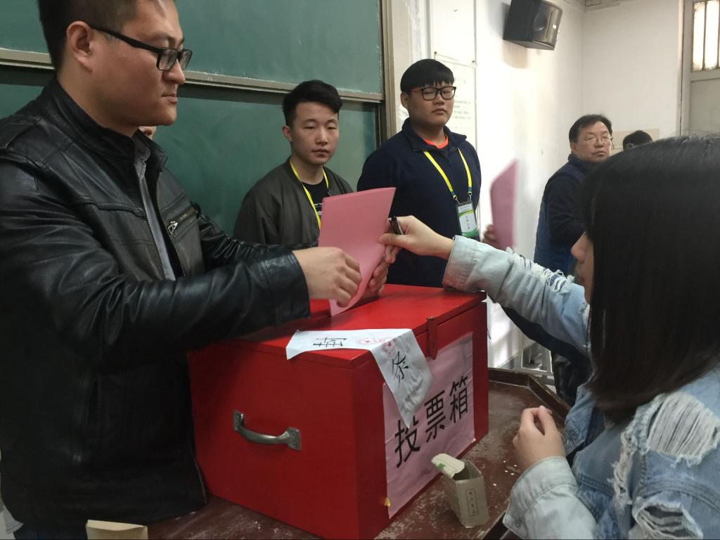 4月12日中午,本科生党员分会场和研究生党员分会场首先分别在主楼226、228教室进行。包括毕业生党员在内的近300名正式党员按照学院党委的要求准时到场参加大会。大会在庄严的国歌声中拉开帷幕。李筱胜书记分别到两个会场将选举投票的有关要求传达给每一位党员,并将每一名候选人的情况行了简要介绍。每名党员在经过慎重考虑后在选票上勾选了自己推荐的党员代表。之后,所有党员按照大会主持人的要求,排队依次将自己的选票投到指定选票箱内。大会指定的监票人和计票人认真履行自己的职责,完成了两个分会场投票选举的监督和计票工作。