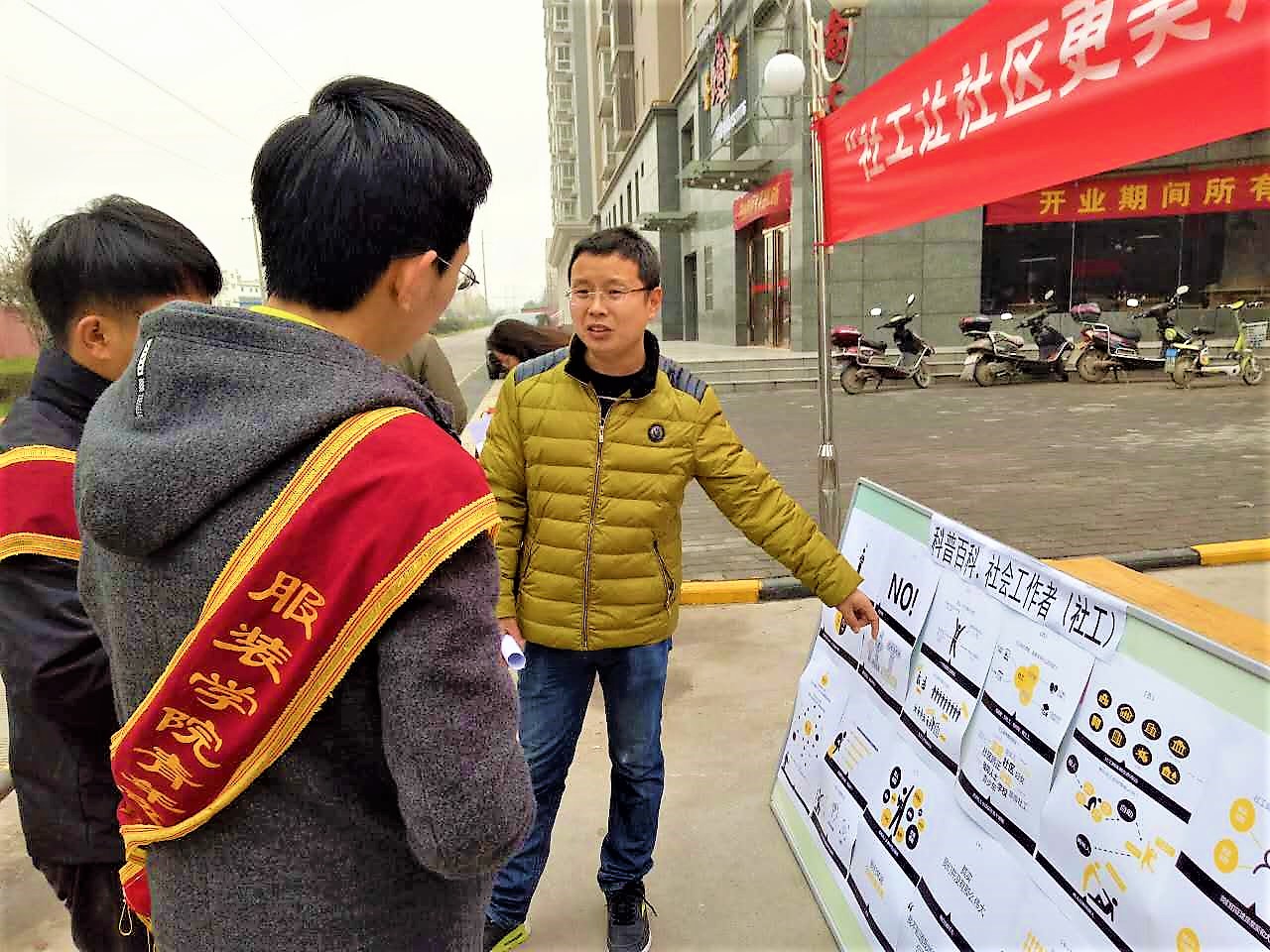 服装学院每年三月的第三个星期二是世界社会工作日。而今年是第八个世界社会工作日,今年工作日的主题是:促进社区与环境可持续性,服装学院的志愿者们帮助工作者们布置了宣传现场,之后社区工作者为志愿者们讲解了本次活动的意义及大家的宣传内容,之后大家便积极的参与到了宣传活动中,志愿者们积极的对小区区民进行宣传讲解,受到小区区民的热情关注,大家都积极的配合学习社区工作的知识。