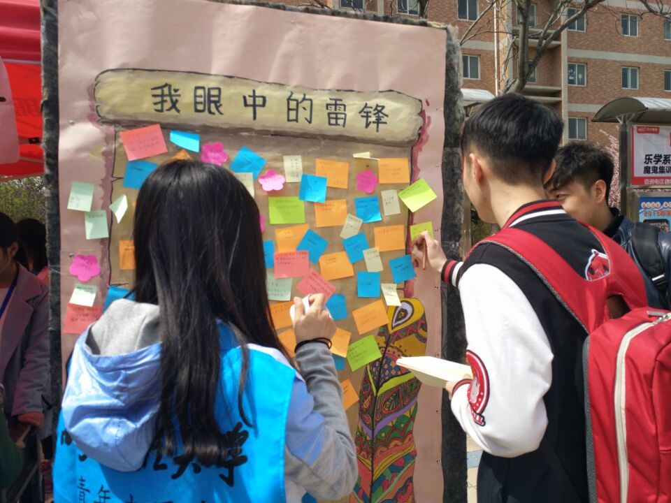 活动初由志愿者宣读雷锋精神演讲稿,吸引过往学生,以“我眼中的雷锋”便利签的方式让学生们参与活动,参与者也会得到由青分队干事们准备的小礼物。活动期间还特设一名小记者,对来往的同学进行采访,在丰富活动的内容的同时,也有利于雷锋精神的传播。在学长学姐的带领下,青分队干事们协作同行,吸引了广大学生参与,这就达到的活动所需要的效果,且本次活动筹备充分,为活动的成功举办奠定了一定的基础。