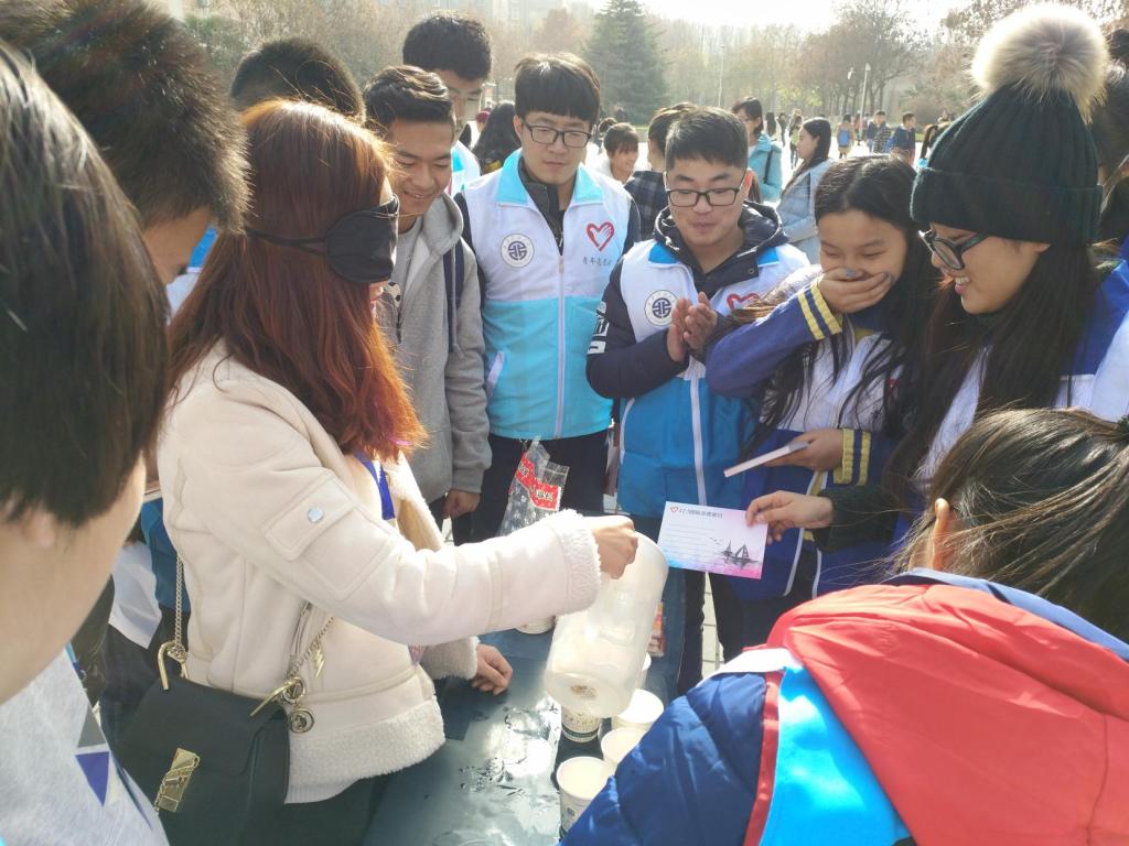 中午12点活动正式开始,首先来自各院的志愿者们合唱了《志愿者之歌》以此来吸引过往学生的注意,调动现场气氛,接着由各院志愿者分别向同学介绍各自队伍的工作历程,展示照片墙,并进行了签名活动也邀请同学们在意见栏中写下对志愿活动的意见和建议。主持人在介绍了国际志愿者日及志愿精神后向参与此次活动的同学们赠送了明信片,在此之后也邀请同学们参加了时光胶囊活动,写下对自己未来一年的话,并在明年的志愿者日领取胶囊,最后志愿者与同学分别进行了聋哑人、盲人、肢体残疾人和听力障碍人的体验游戏。为了彰显志愿主题,志愿者还开展了为期三天的教室清洁活动。