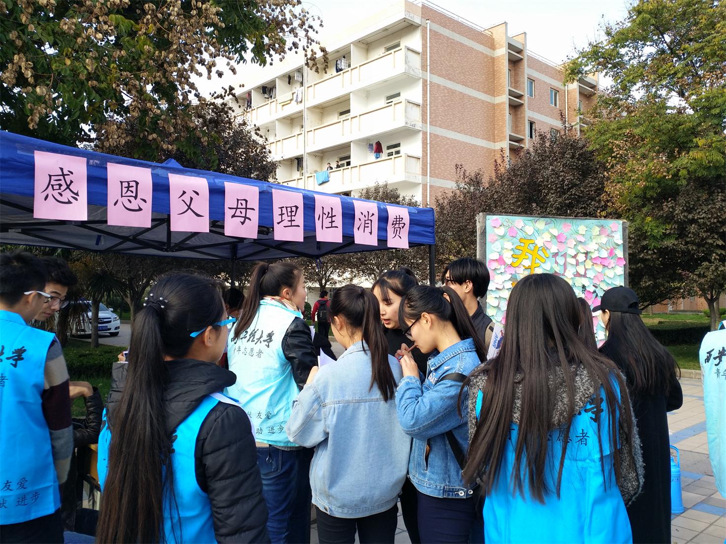 首先,青分队部长李存正,副部长牛玉宁、于思含组织青分队各干事在中心广场上以悬挂条幅、展板等方式对此次活动进行宣传。中午12点活动正式开始,由青分队志愿者朗读活动宣传稿以此吸引更多学生对活动的关注,并向感兴趣的同学讲解本次活动的主题及目的,让同学们在心怀感恩之心的同时也能学会宽容、承受、付出、回报,并在双十一之际传播合理消费的理念。在志愿者的解说下,很多同学积极参加了此次活动,他们在感恩墙上写下一句句感谢父母的话语,也有同学现场拿出了手机给父母打了电话,以此来表达着对父母的感谢与思念。最后志愿者为参与活动的同学赠送了小礼品,以表达同学们对此次活动的大力支持。活动期间志愿者各司其职,做到不玩手机,不闲聊,穿戴整齐,文明礼貌,体现了志愿者的义务服务精神。