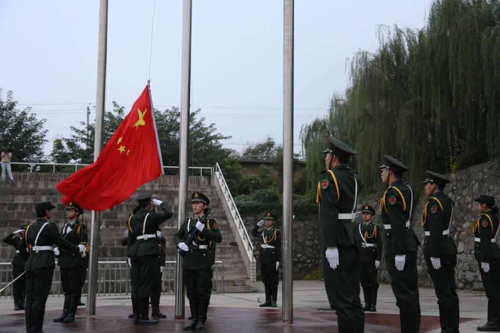 7:00整在全体师生的注目礼下,英姿飒爽的国旗护卫队队员们护送鲜艳的五星红旗进场,行礼完毕,伴随着庄严的中华人民共和国国歌,五星红旗冉冉升起,迎风飘扬。在场的每一个人向国旗行注目礼,深怀对祖国无限的热爱和崇高的敬意。