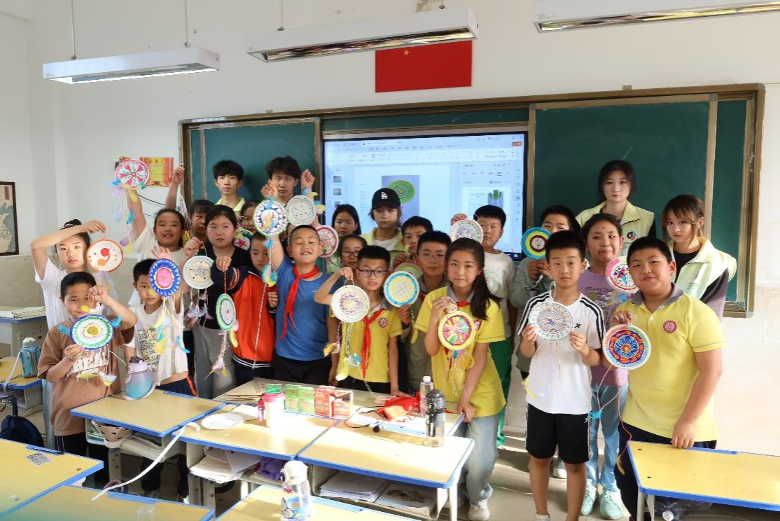 在课程开始前,大学生志愿者先向孩子们展示了制作精美的捕梦网成品图,并详细讲解了捕梦网的制作过程和技巧,小朋友们听完后都跃跃欲试,迫不及待地接过了材料,开始了他们的创作之旅。在制作过程中,大学生志愿者们引导小学生们加入了中国传统的吉祥图案,如福字、如意、祥云等,挂上中国结、玉坠、铜钱等具有中国特色的小物件进行装饰,增添文化韵味,使其既有捕梦网的形态,又蕴含中式吉祥寓意,同时还讲述了与中国传统文化相关的故事或传说,赋予其更深厚的文化背景。在制作完成后,继续引导学生们选取中国传统色彩,如红色、金色等,来装饰捕梦网,赋予这些色彩的独特情感和象征意义。课程最后,小朋友们手里拿着自己亲手制作的捕梦网,脸上洋溢着开心的笑容,与大学生一起合影留念。
