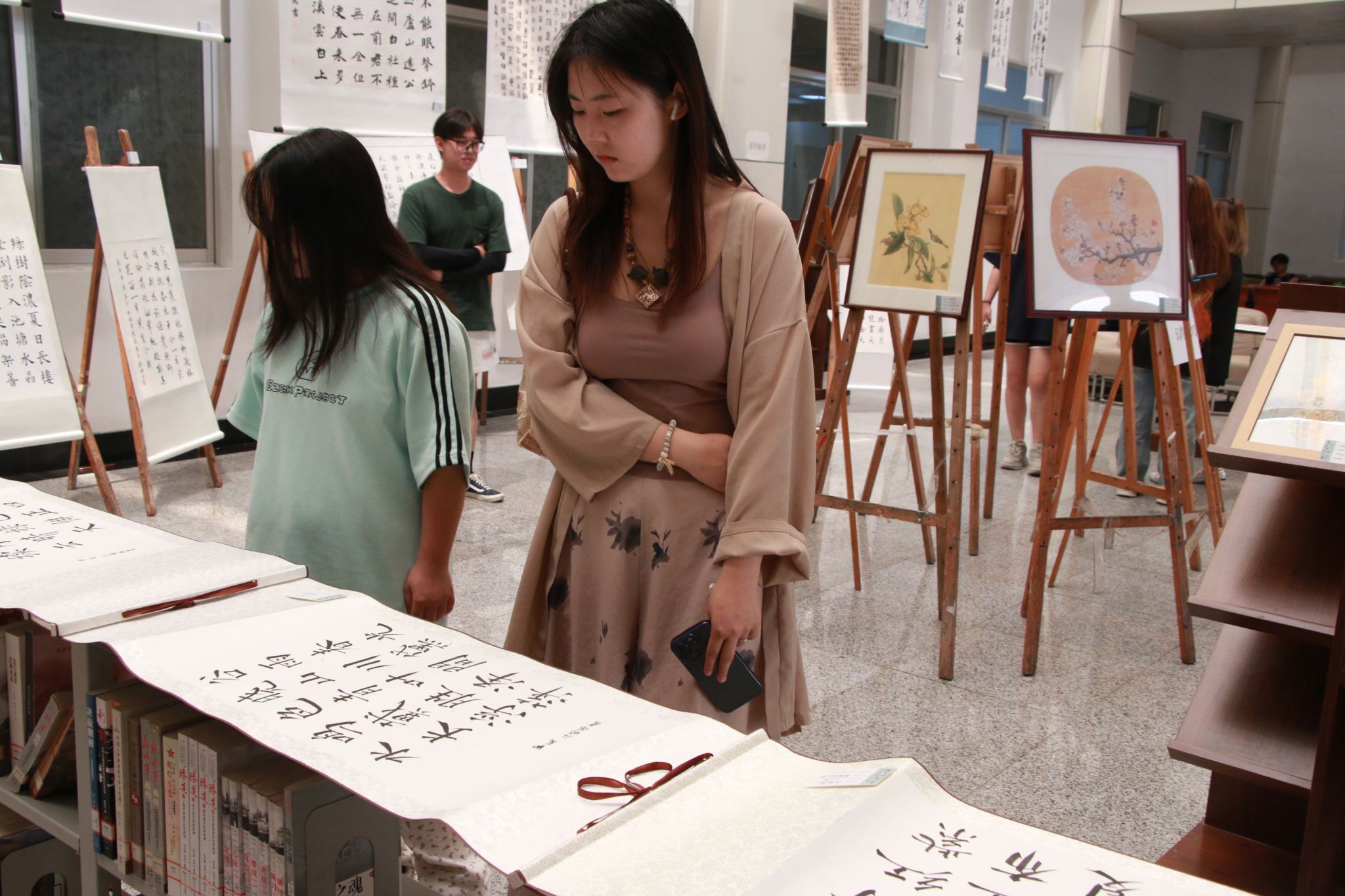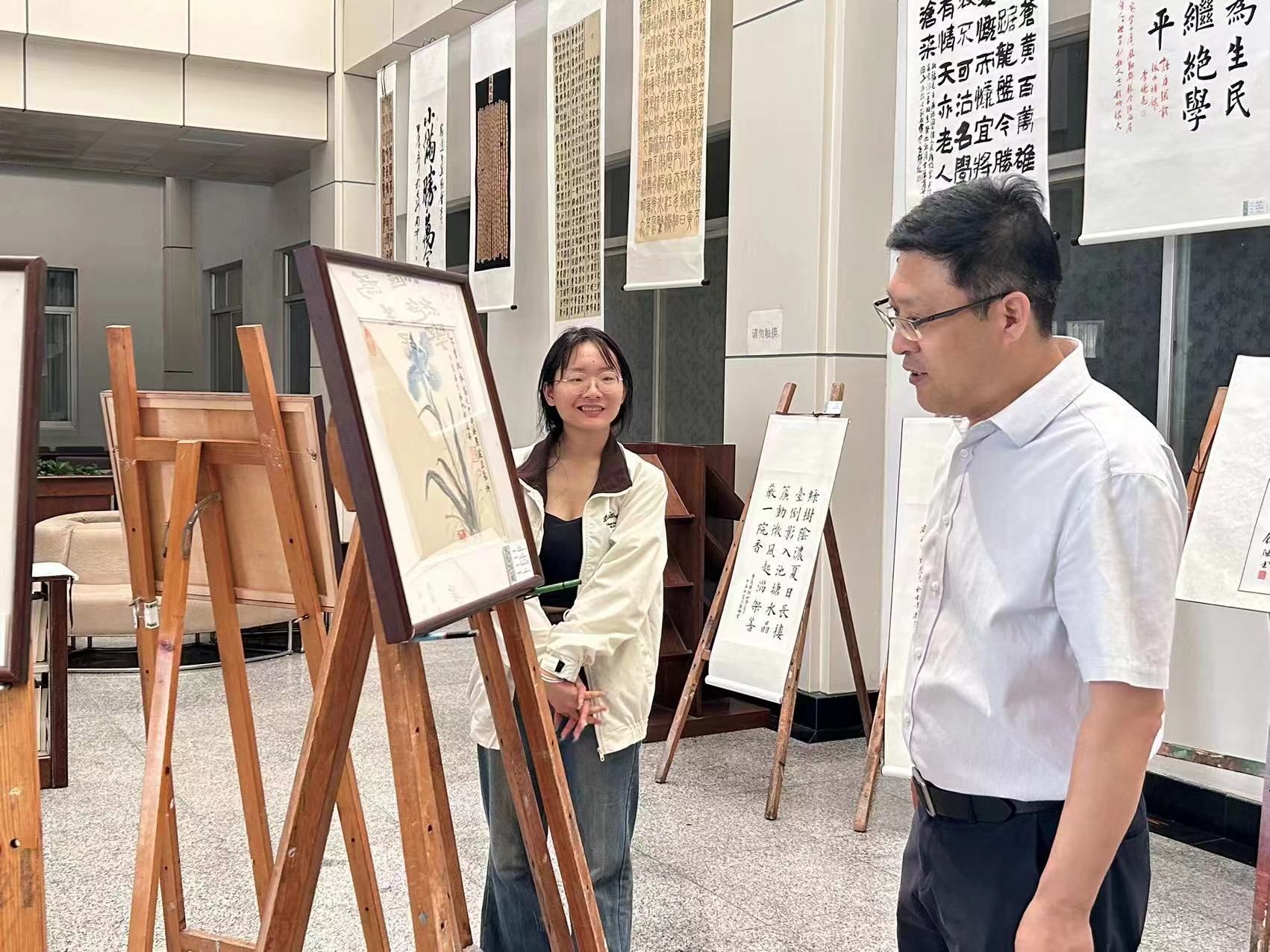 翰逸书画协会于2024年5月27日起在临潼校区图书馆一楼大厅,面向全校师生举行“意境流转,书画雅集”二十四节气专题学生书画作品展,吸引众多师生前来参观。书画协会的成员热情地向服装学院党委书记苏博、副书记马磊以及现场师生介绍展品情况。