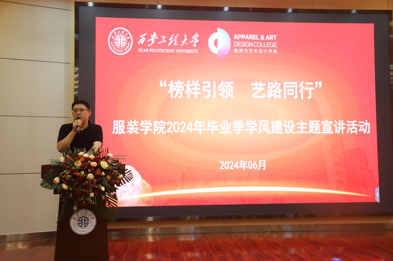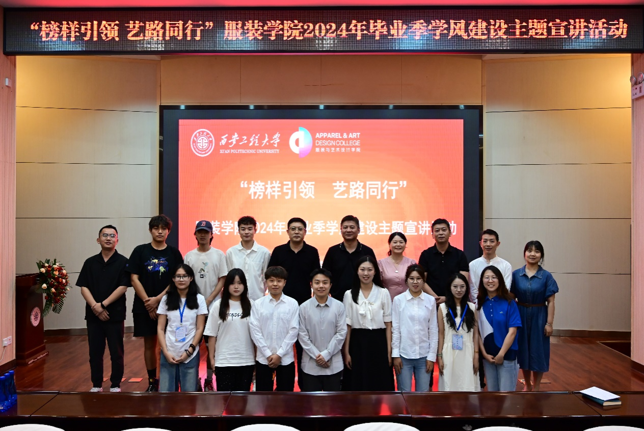 在金花校区西纺报告厅举办“一站式”学生社区建设“榜样引领·艺路同行”2024年毕业季学风建设主题宣讲活动。学院党委书记苏博、院长吕钊、副处级组织员吴艳杰、院团委书记马薏雯以及各年级辅导员参加活动,2024届优秀毕业生李博帆、苗卓、吴以唯、张嘉轩、苏静怡作为宣讲团成员为学院本科一、二年级学生代表、入党积极分子和中英合作办学项目学生分享学习经验。活动由院学生会主席团成员华子扬主持。