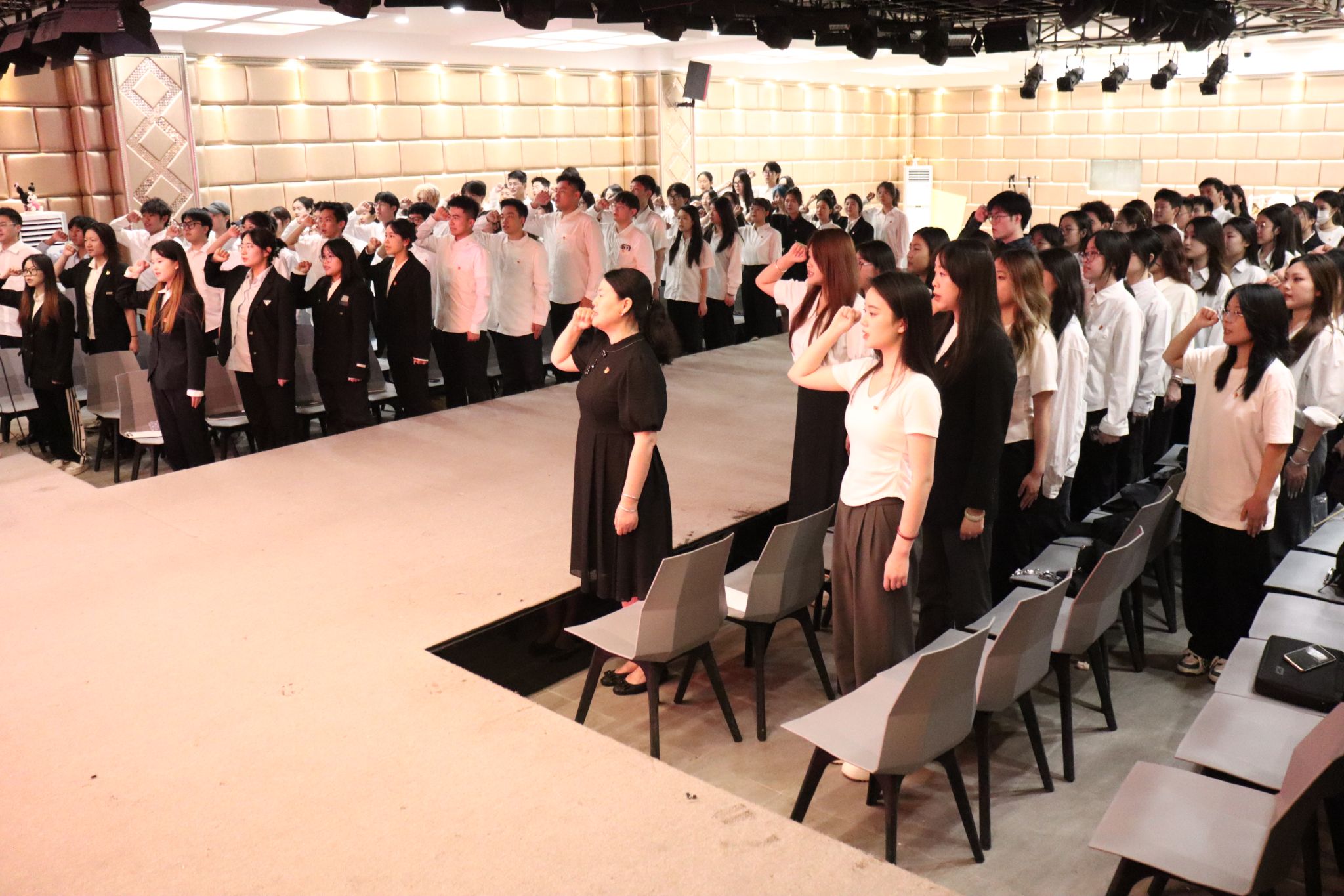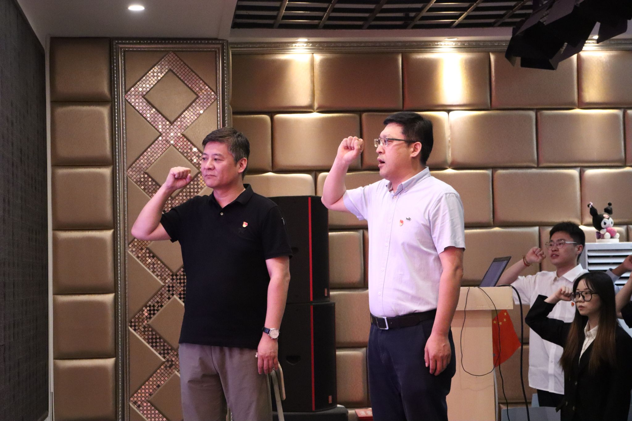 活动在雄壮的的《国际歌》中开始,随后苏博领读誓词,带领全体新党员进行入党宣誓,老党员重温入党誓词,新党员佩戴上党徽,高举右拳,庄严宣誓,铮铮有力的誓言回响在大厅内,更深植在每位党员心中。预备党员代表李懿宣在发言中表达了要努力成为一名优秀共产党员的决心和信心,要以更高的标准严格要求自己,在各方面以身作则,给同学们树立良好的榜样。