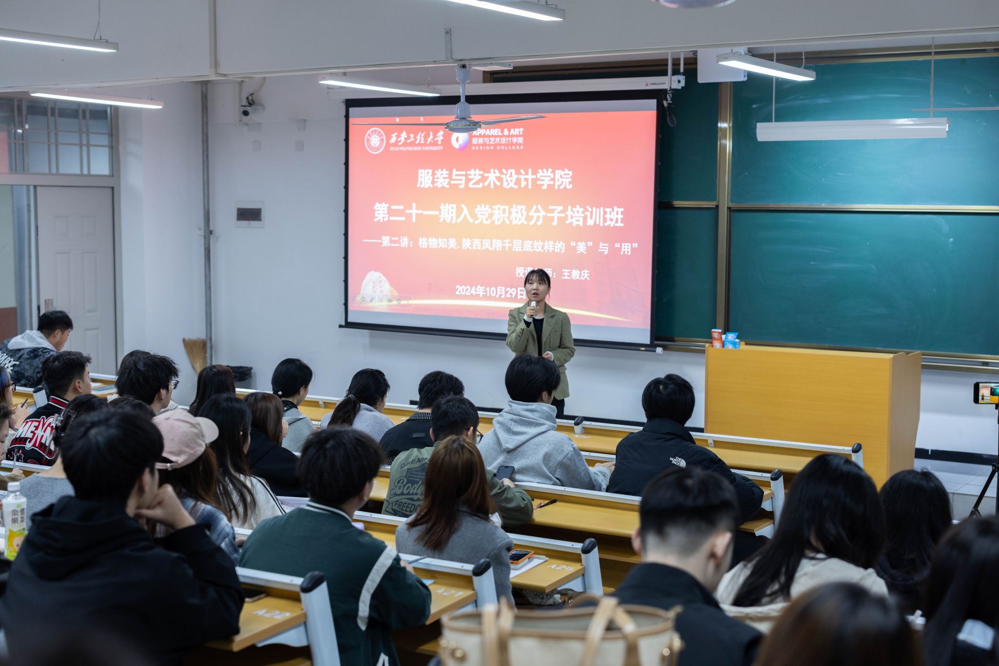 在金花校区主楼203教室举办第21期入党积极分子培训班的第二讲专题党课。本次讲座的主题是“格物知美,陕西风翔千层底纹样的美与用”,授课教师是学院教师产品设计专业系党支部书记王教庆,会议由22级辅导员张一诺主持。