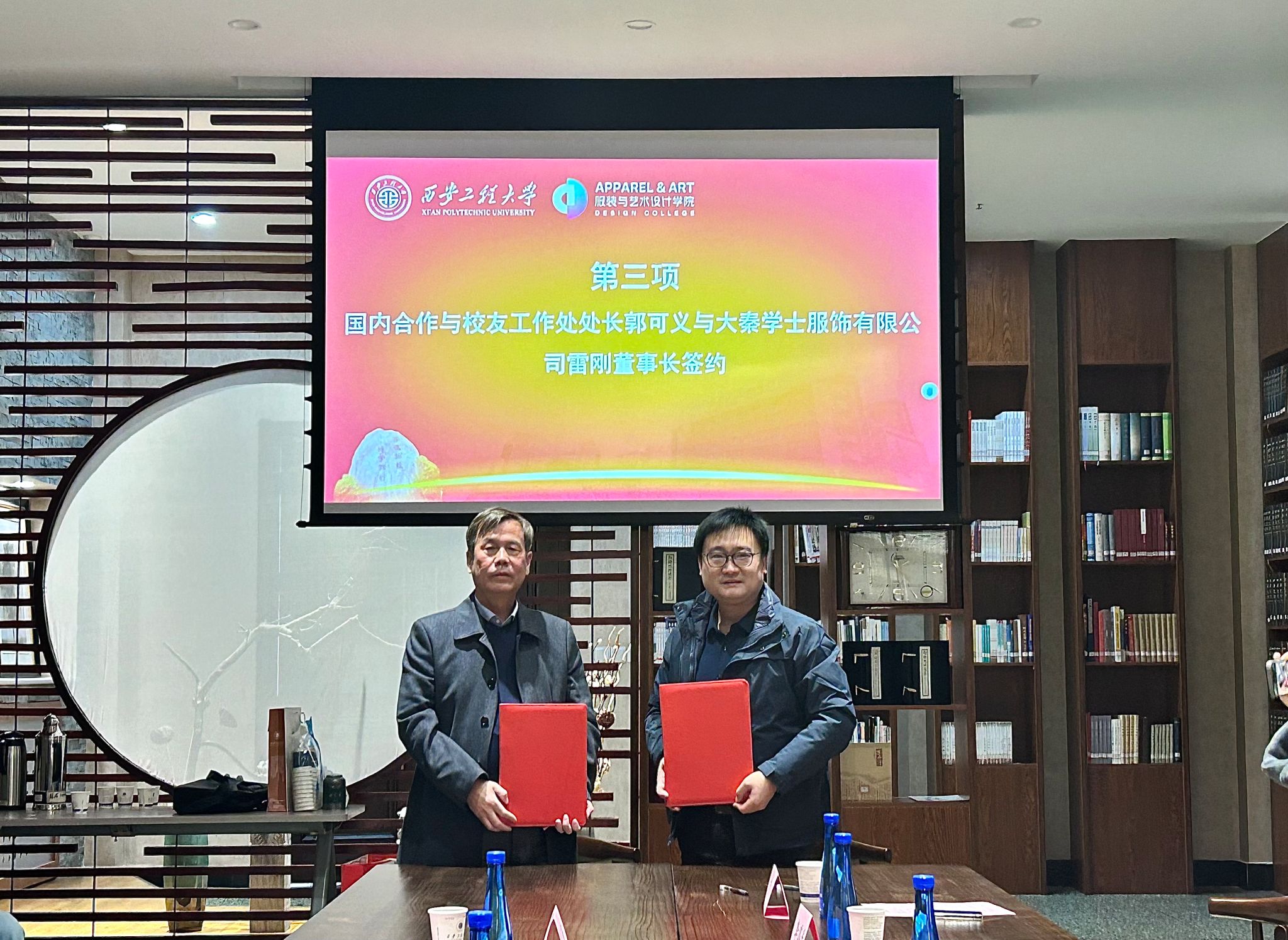 11月27日下午,“大秦学士奖学金、奖教金”签约仪式在我校临潼校区图书馆骊山书院举行。陕西大秦学士服饰有限公司董事长雷刚、董事长助理刘芳、行政总监王佳,我校国内合作与校友工作处处长、教育发展基金会理事长郭可义、党委学生工作部(处)副部长李路瑶出席签约仪式,服装学院党委副书记马磊,2024级辅导员邵巍、姜萌,服装学院学生代表参加签约仪式。签约仪式由服装学院学生工作办公室主任蔺晓珣主持。