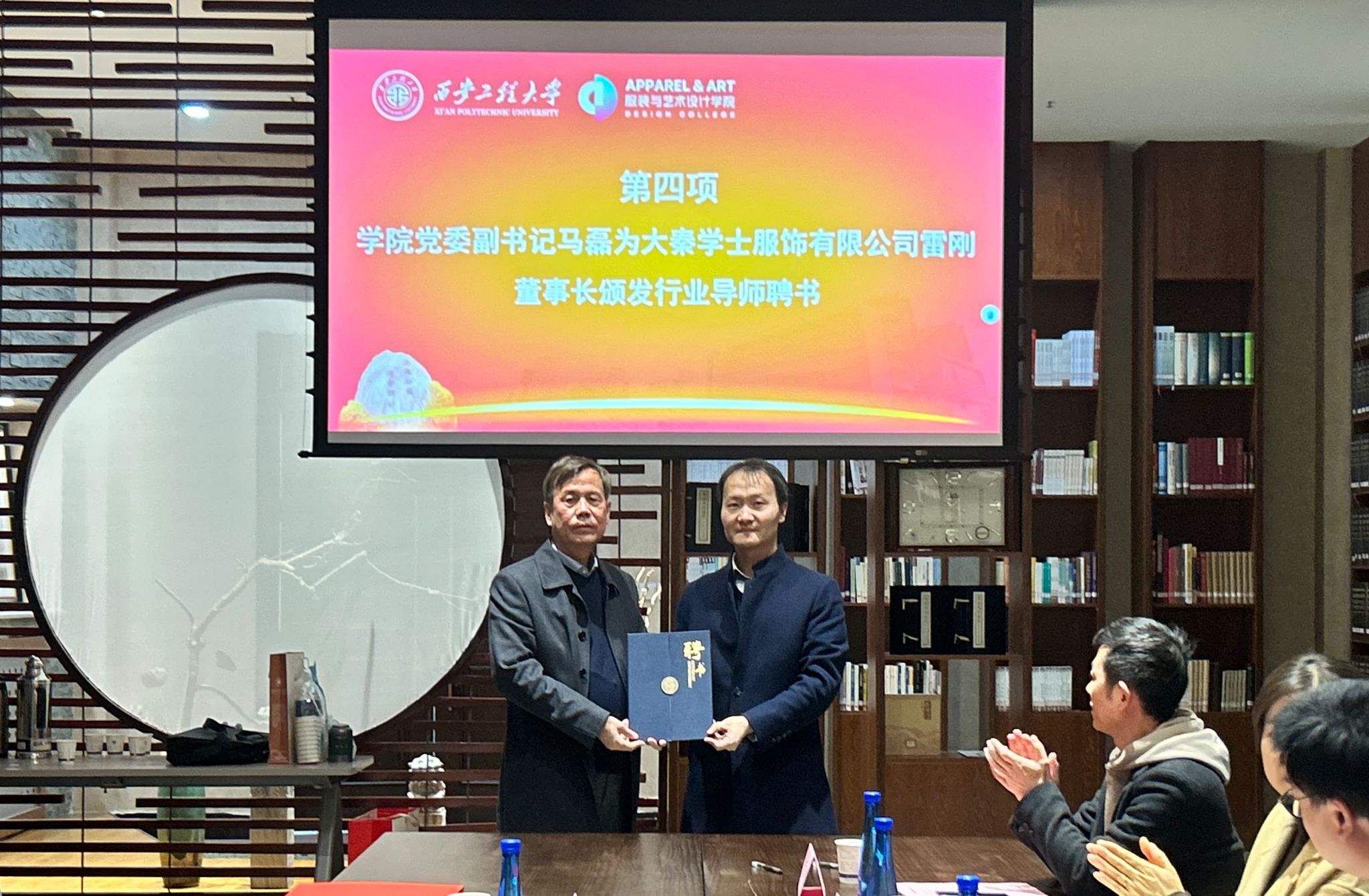 李路瑶就我校发展历程、学科特色进行了介绍,向与会人员分享了我校学生奖助工作的开展情况,对奖学金评选范围、申请条件、审核流程进行讲解,同时鼓励与会同学认真学习、争优争先、不负青春。马磊代表服装学院为雷刚董事长颁发行业导师聘书。