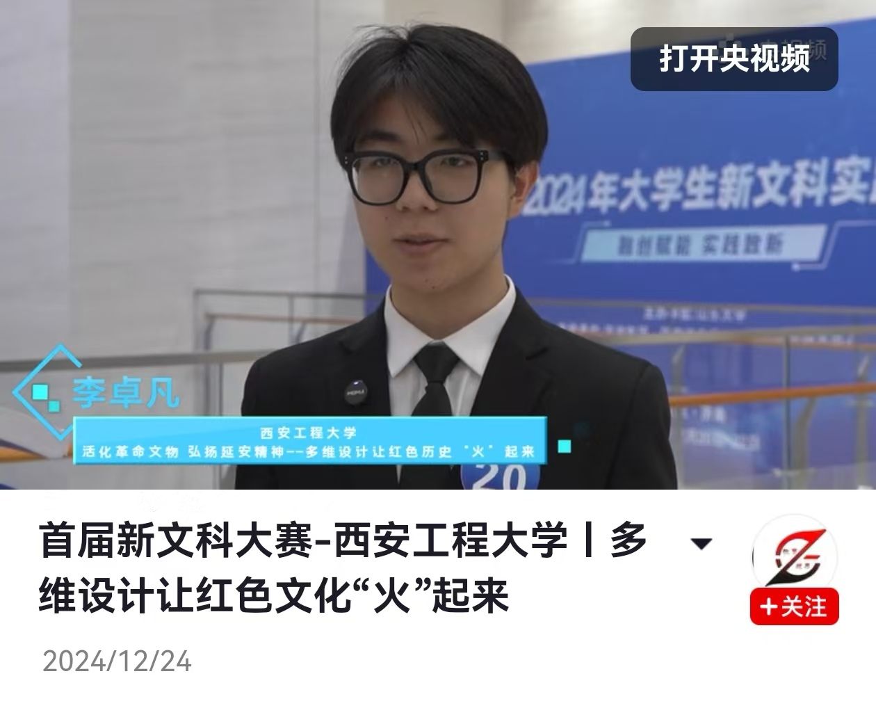 “红艺新苗”本科生团队表现优异,成功晋级决赛并斩获国家级银奖。该团队由服装学院彭东梅和马克思主义学院刘敏两位教师共同指导,彭冬梅及其团队成员李卓凡同学代表团队接受央视频APP教育视界栏目采访,深入讲解红色文化多维设计成果。