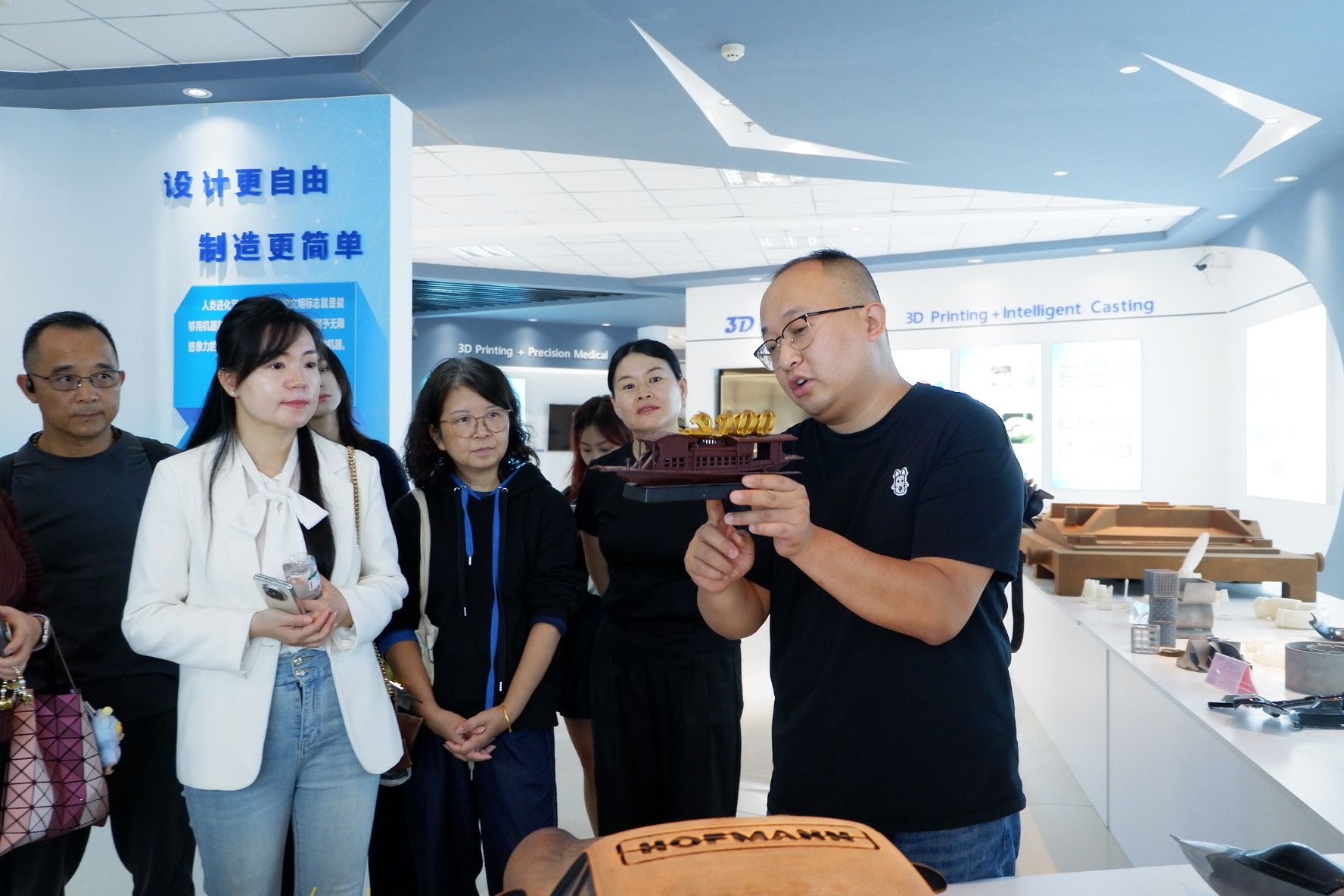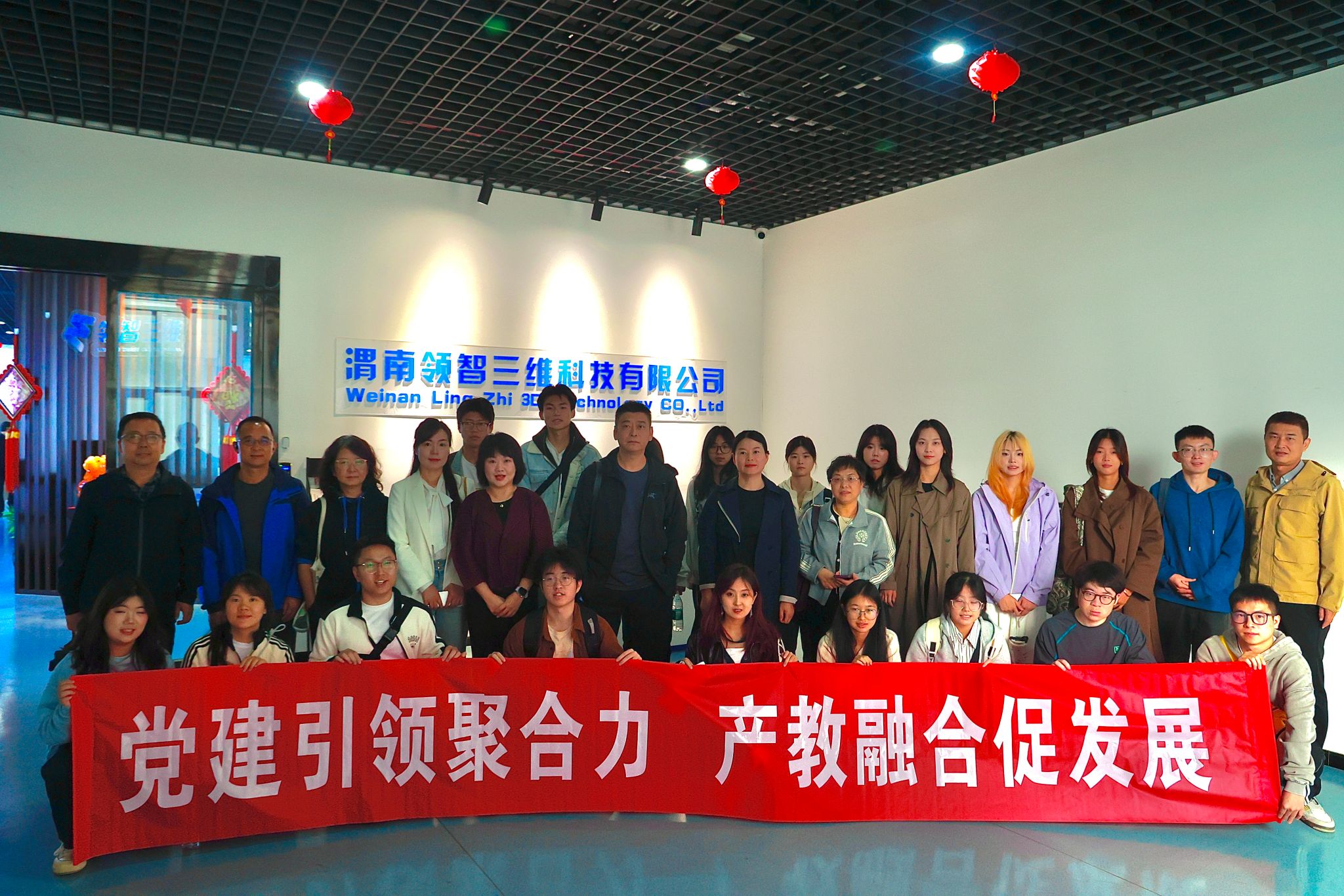 上午,师生党员首先来到渭南领智三维科技有限公司,将党性教育课堂搬到企业生产一线。在丁军涛总经理的带领下,大家参观了三维科技展示区,详细了解了三维扫描、数字建模及智能制造等前沿技术。随后,一行人前往渭南职业技术学院,实地参观了3D打印创新应用示范中心,系统观摩了从数字建模到产品打印的全流程。师生们就三维技术在服装个性化定制、人体工学建模等领域的应用前景与企业进行探讨交流。大家表示,此次学习极大地拓宽了专业视野,为今后的教学与科研提供了宝贵的产业一线视角。
