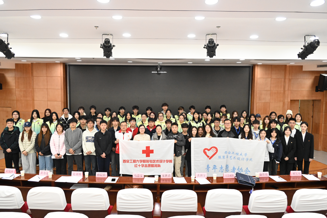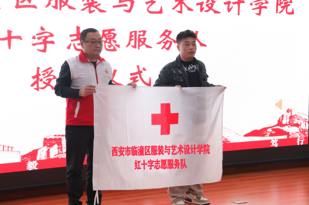 红十字志愿服务队授旗仪式。参与本次会议的有西安市临潼区红十字会宋世君、服装学院团委书记马薏雯、服装学院团委副书记孙晨倩、黄博宇、25级新生辅导员王雷雨阳,校青协及各学院代表和新生志愿者180余人。