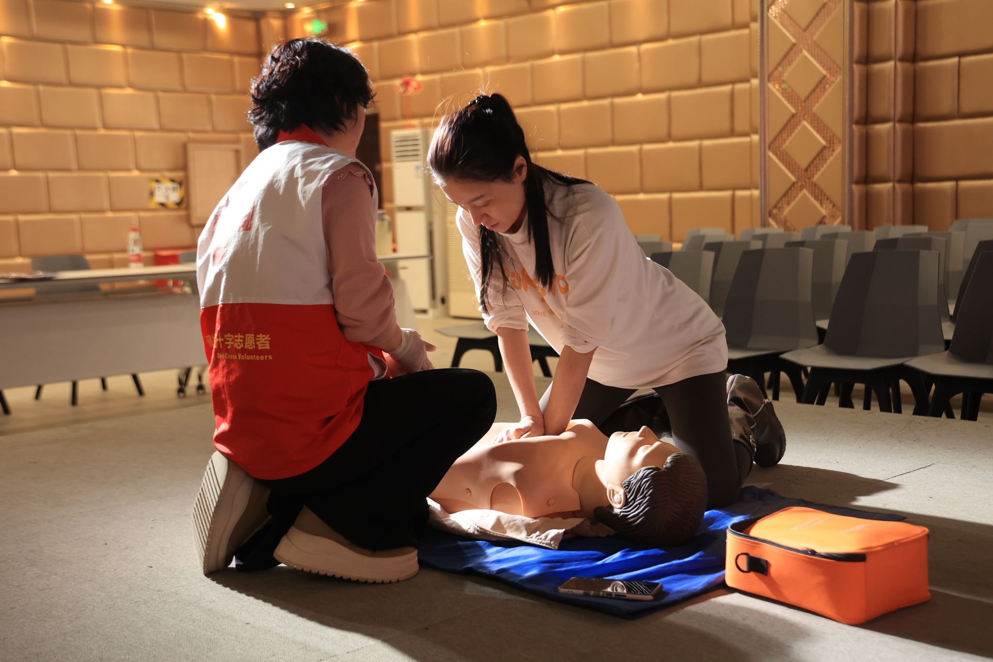培训现场氛围浓厚,培训讲师手把手示范指导,女教职工们认真学习、积极实操,从理论认知到动作练习,逐一掌握急救流程与操作要点。培训结束后,通过考核的教职工均获颁红十字会《心肺复苏(CPR+AED)培训证书》。