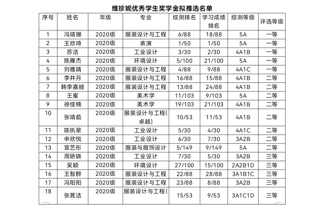 评选安排,名额分配为:2020级“维珍妮优秀学生奖学金”名额为21名,其中具体奖项分配名额为(一等奖5名、二等奖8名、三等奖8名)。“美的未来奖学金”二等、三等各1名。“维珍妮创新奖学金”6名;2021级“维珍妮引领之星奖学金”名额为20名,其中具体奖项分配名额为(组织引领奖5名、道德引领奖5名、实践引领奖5名、自强引领奖5名)。“维珍妮创新奖学金”名额为4名。经各年级初评,资助领导小组讨论,党政联席会通过,现将评选名单进行公示。公示时间为2021年11月27日至11月29日。如有异议,请于公示时间内向所在年级辅导员反映。