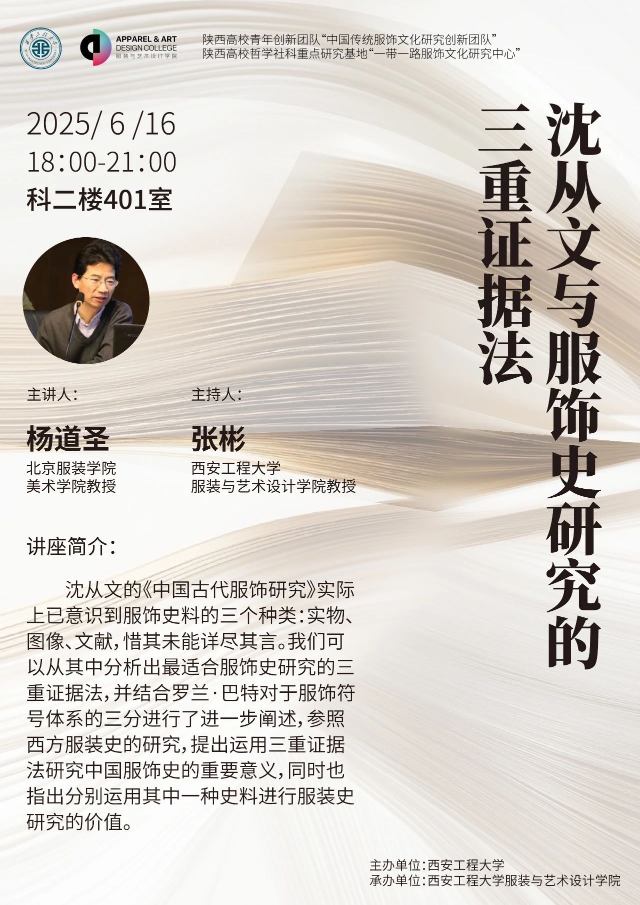 讲座简介:沈从文的《中国古代服饰研究》实际上已意识到服饰史料的三个种类:实物、图像、文献,惜其未能详尽其言。我们可以从其中分析出最适合服饰史研究的三重证据法,并结合罗兰·巴特对于服饰符号体系的三分进行了进一步阐述,参照西方服装史的研究,提出运用三重证据法研究中国服饰史的重要意义,同时也指出分别运用其中一种史料进行服装史研究的价值。