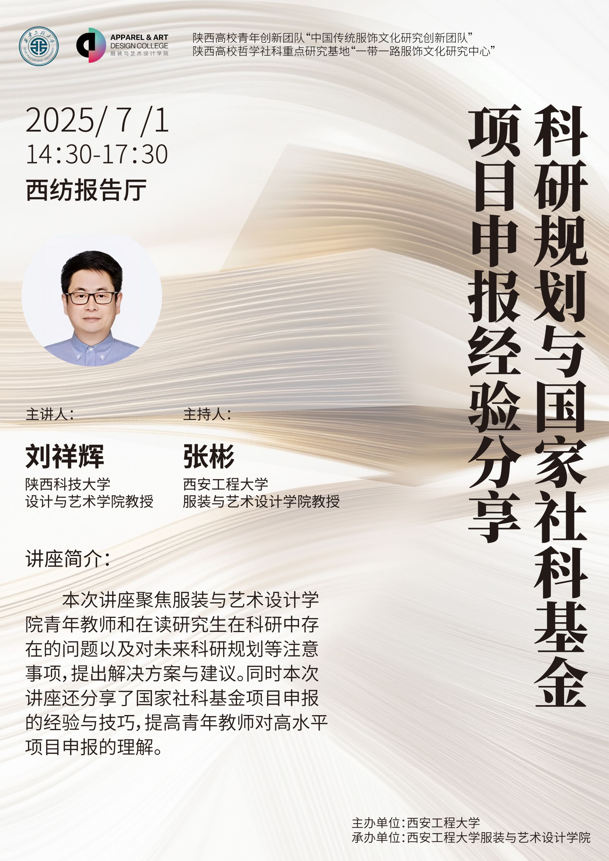 主讲嘉宾简介:陕西科技大学设计与艺术学院教授,博士生导师,陕西省非遗刺绣传承创新研究基地副主任、陕西科技大学丝路文化遗产研究中心主任。中国考古学会会员、中国工艺美术学会会员,河南省公共文化研究中心特聘研究员。北京大学与清华大学访问学者。陕西省“三秦英才”、陕西科技大学“学术骨干人才”。主要从事设计史与古代物质文化、美术史与美术考古、金石文献与古代书法史研究,以及丝路文化遗产传承、保护与研究。主持国家社科、国家艺术基金项目2项,教育部人文社科及省社科基金4项,其他地厅级项目10余项;参与国家、省部地厅级项目10余项;辅导国社科、艺术基金项目立项近二十项;获教育部全国教师教育课程资源优秀奖2项、河南省高等教育成果一等奖1项、河南省级教育成果奖2项,河南省教育厅网络课程1等奖2项,教育厅高等教育组精品课程一、二、三等奖若干项;授权国家发明专利、软件著作权若干项;在《美术研究》《中国书法》《中国陶瓷》《四川文物》等刊物发表文章二十余篇,出版《洛阳三彩艺术》等著作3部。