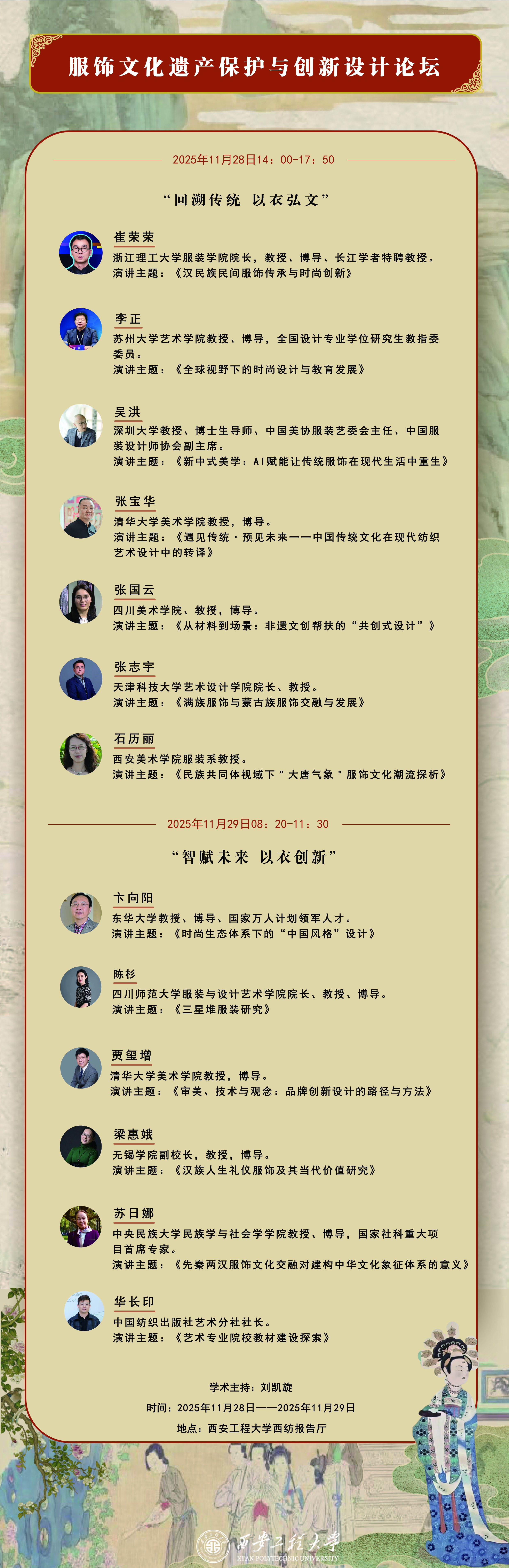 红桃视频 将于11月28-29日举办《服饰文化遗产保护与创新设计论坛》,邀请了13位国内服饰文化领域最知名的专家。欢迎校内外师生来我校学习交流(不收任何费用,食宿、差旅自理)。