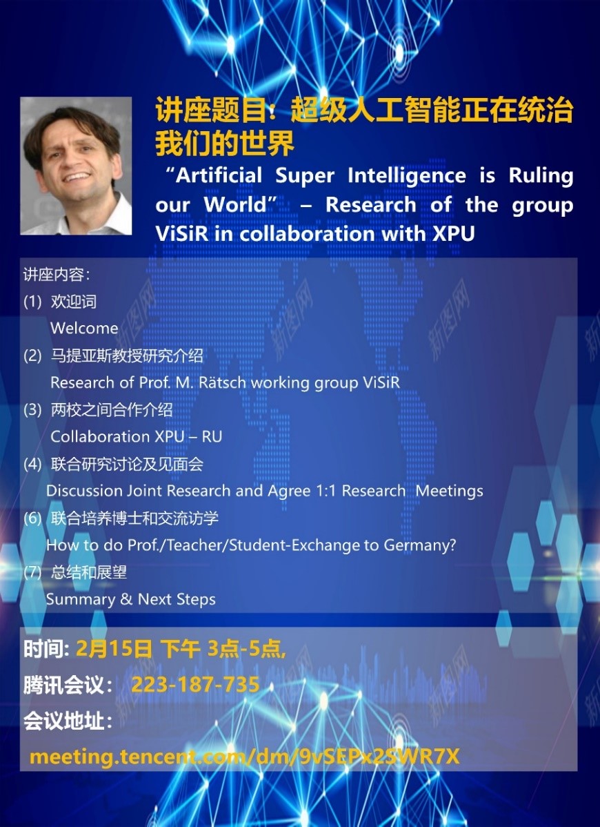 2月15日下午,服装学院服装工程系于腾讯线上会议举办主题为《超级人工智能正在统治我们的世界》的讲座。此次讲座邀请我校外国专家德国洛特林根大学教授马提亚斯•莱茨奇(Matthias Rätsch)教授主讲,讲座由服装工程系副主任吴龙老师主持,服装学院副院长袁燕老师对于马提亚斯教授的到来表示感谢。国际处、服装工程系相关科研团队负责人、教师代表及研究生参与了此次活动。