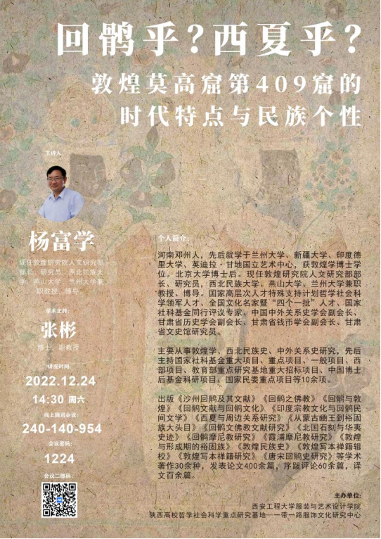 举办了一场学术讲座,本场特别邀请到了敦煌研究院人文研究部部长、研究员,西北民族大学、燕山大学、兰州大学兼职教授、博导杨富学老师。他以“回鹘乎?西夏乎?·敦煌莫高窟第409窟的时代特点与民族个性”为主题进行了精彩报告,会议由张彬副教授主持。两个小时的讲座结束后,与会师生进行了同样精彩的交流互动环节。